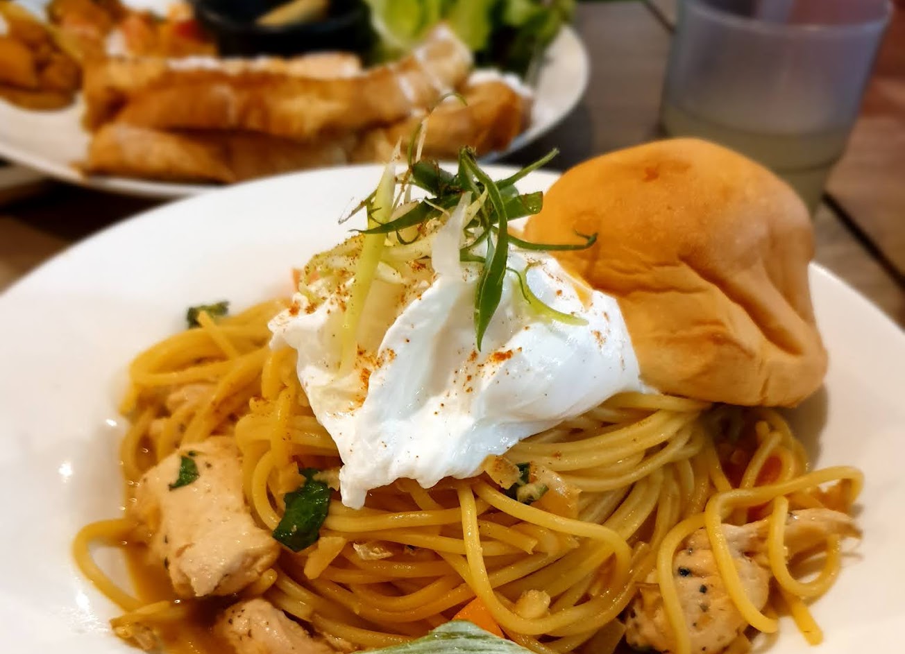 當天點了口味比較特別的義大利麵和燉飯,分別是三杯雞佐水波蛋義大利麵和叻沙南洋雞肉風味燉飯