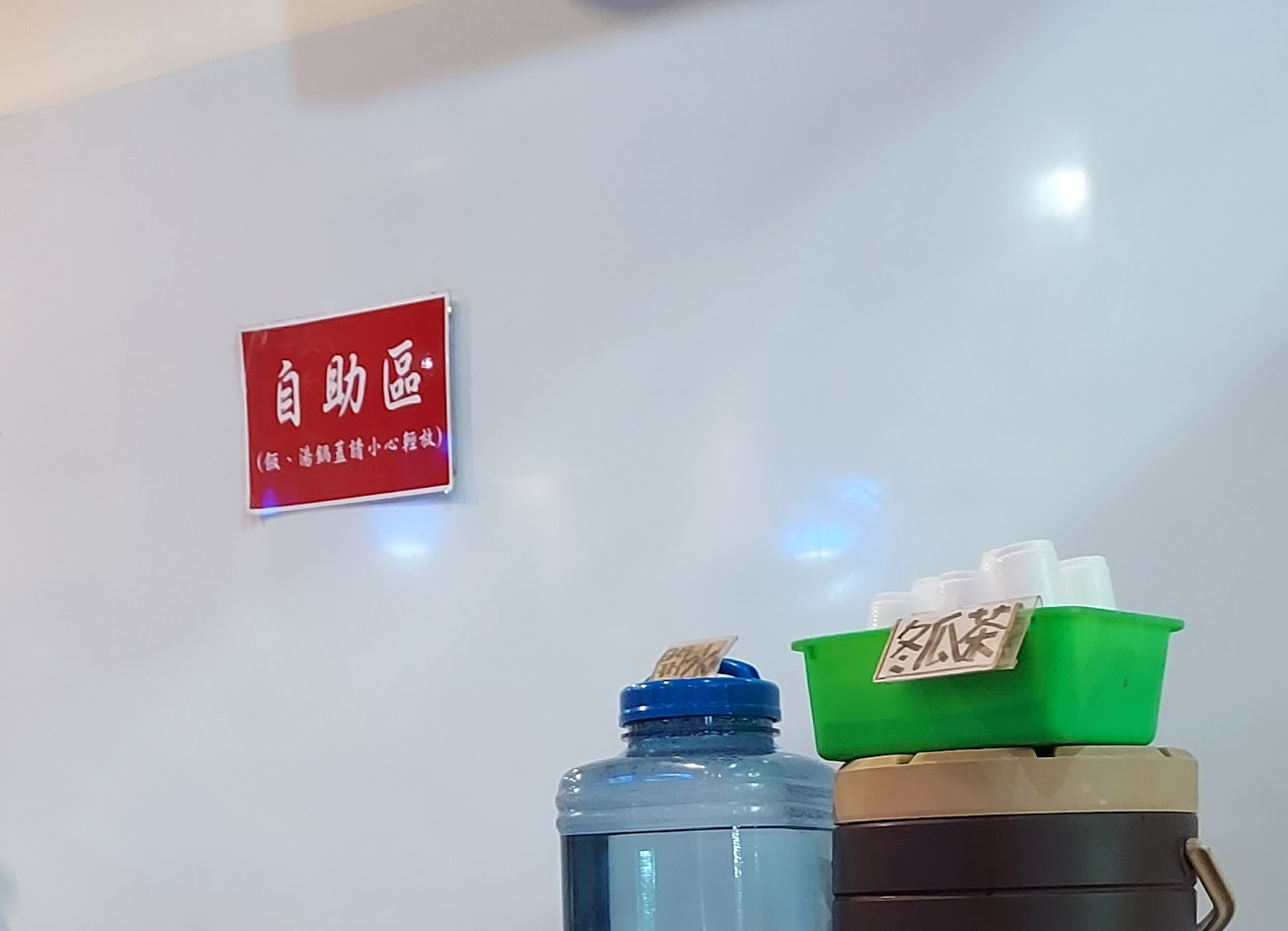 採自助式取白飯、清湯、冬瓜茶和餐具
