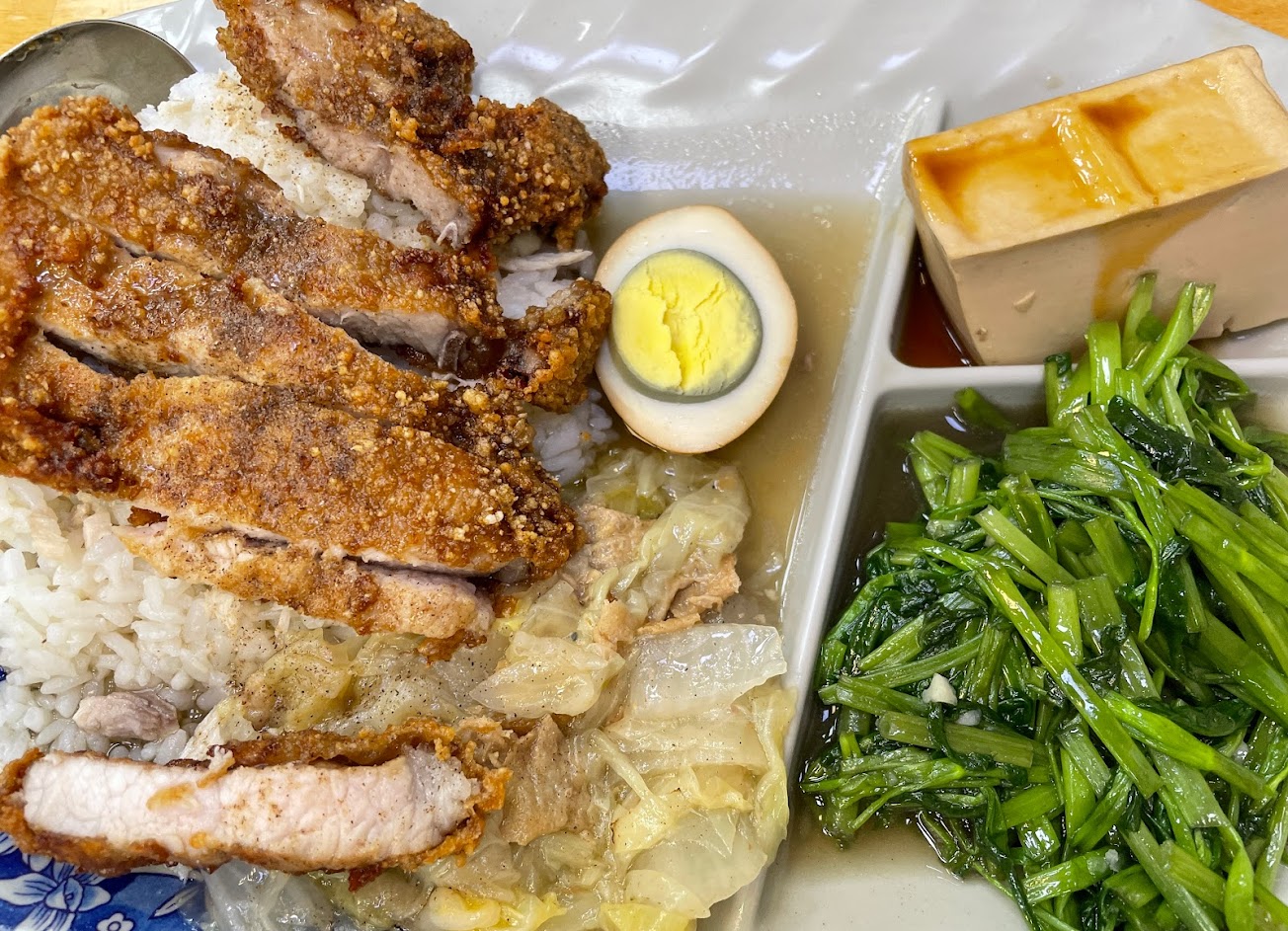 – ? 火雞肉飯 小/ $30 ? 冬瓜排骨湯 $55 ? 炸五香雞捲 $55 ? 炸排骨 $55 ? 炒青菜 $40 ? 滷蛋 $10 – 大紅色老招牌,有著內用冷氣區,每次經過看這長長的菜單,以及聞到那濃郁炸肉味,總是被吸引進去光顧。 – #火雞肉飯 必點人氣主食,口味偏甜,屬於南部口味,超嫩的雞肉絲,看得出來是店家親自手撕,帶皮帶肉肥瘦雞絲,底下是雞油淋飯,趴飯時很香,吃起來濕潤度很夠,缺點是吃到底,最後那幾口米飯有點油(雞油沉底)。 – #冬瓜排骨湯 湯頭很棒,店家是一盅盅燉煮,湯清甜又乾淨無雜質,排骨肉的口感燉煮的很軟嫩,一咬就骨肉分離,很新鮮,冬瓜片則是燉煮得很透,這湯真的很不錯。 – #炸五香雞捲 現炸燙口,肥嘟嘟的雞捲,裏頭肉漿很濃郁,肥瘦兼施,吃起來特別有層次感,加上外層腐皮大火炸酥口感,完全不沾醬就很好吃。 – #炸排骨 醃製過的排骨豬肉下鍋油炸,一起鍋就上桌,很燙很好吃,外皮酥脆到不行,肉質軟嫩,還有肉汁,滿好吃的。 – #燙青菜 空心菜炒大蒜,炒功不錯,不鹹也不油,配飯很不錯吃,份量適中,不會說量少,兩人分食很OK。 – #滷蛋 蛋白滷得很入色又入味,有點脆脆的,滿下飯的。