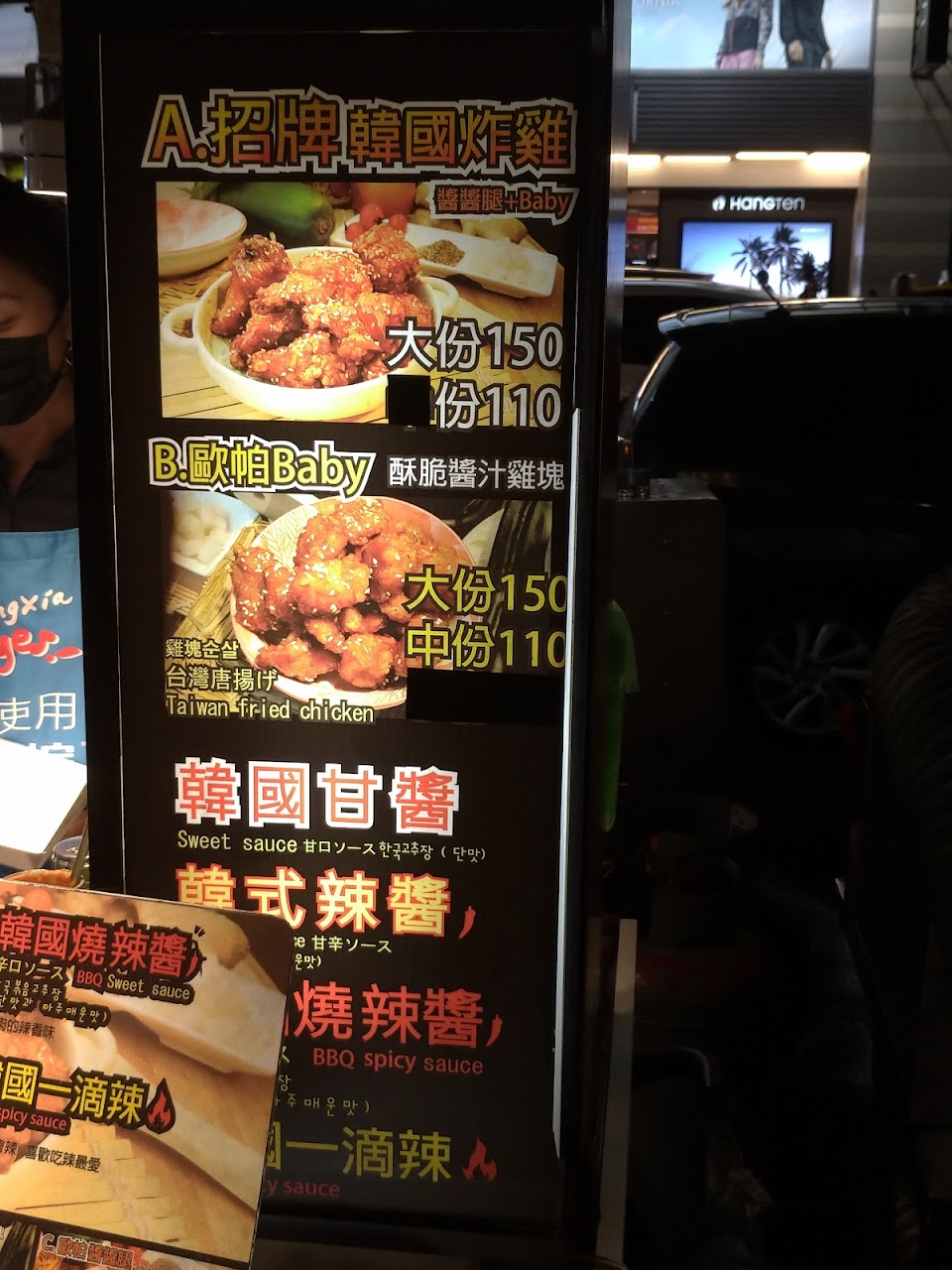 製作台衛生還可以 服務態度普通 價格 普通 是寧夏夜市唯一的韓國小吃 炸雞有 雞胸部位 雞腿肉部位 還有綜合2合1 口味有 甘醬 醬燒 韓國辣醬 一滴辣 大份份量有八分滿至全滿 小份份量有六 七分滿 當晚餐或宵夜都吃得飽 不吃辣的就選甘醬 剩餘的就是辣者天堂 一滴辣可以晉級二滴辣 三滴辣 依照辣的接受度 它家的雞胸肉我很喜歡 星星年糕軟中帶勁 醬汁很多還有加花生粒