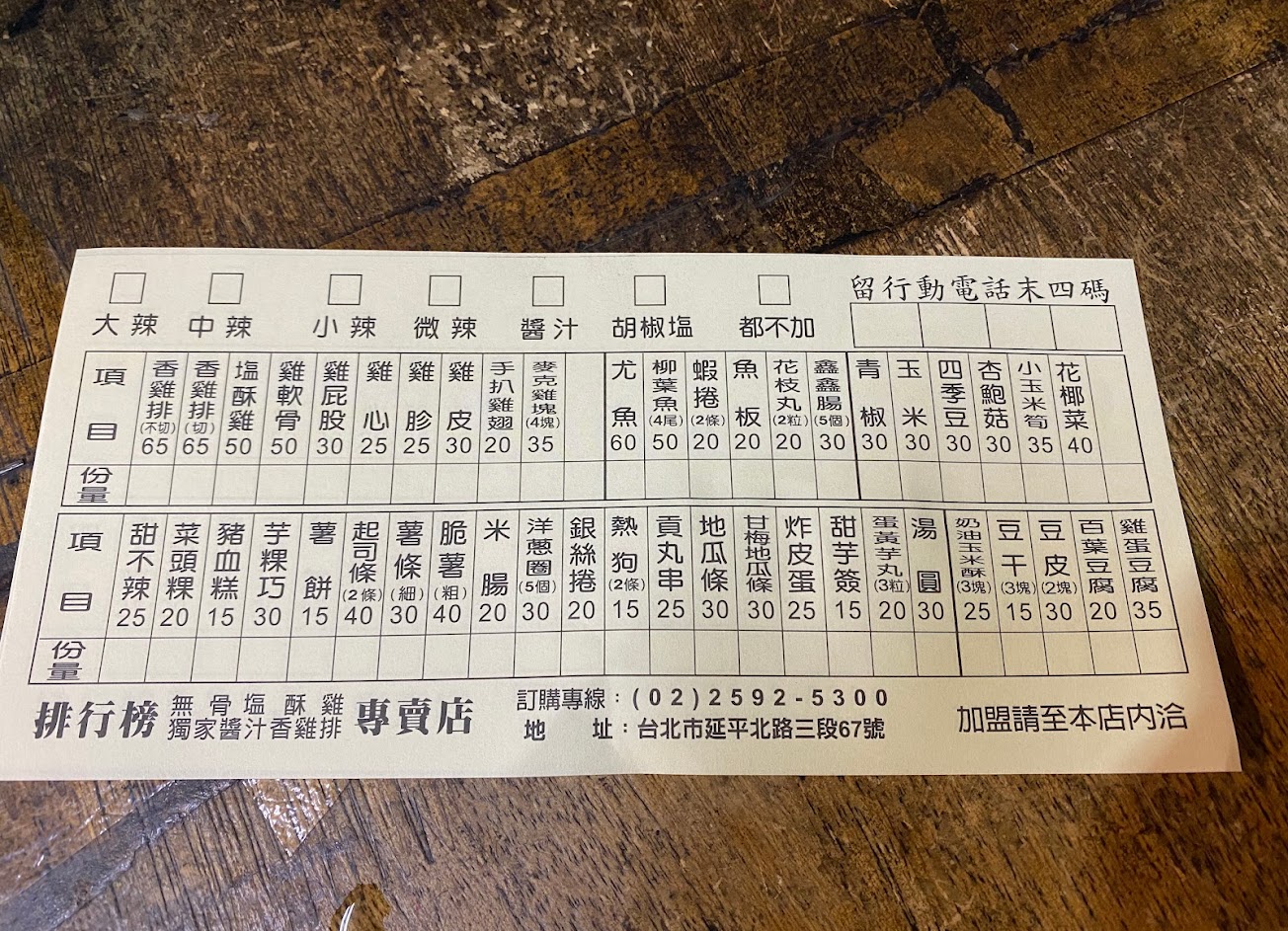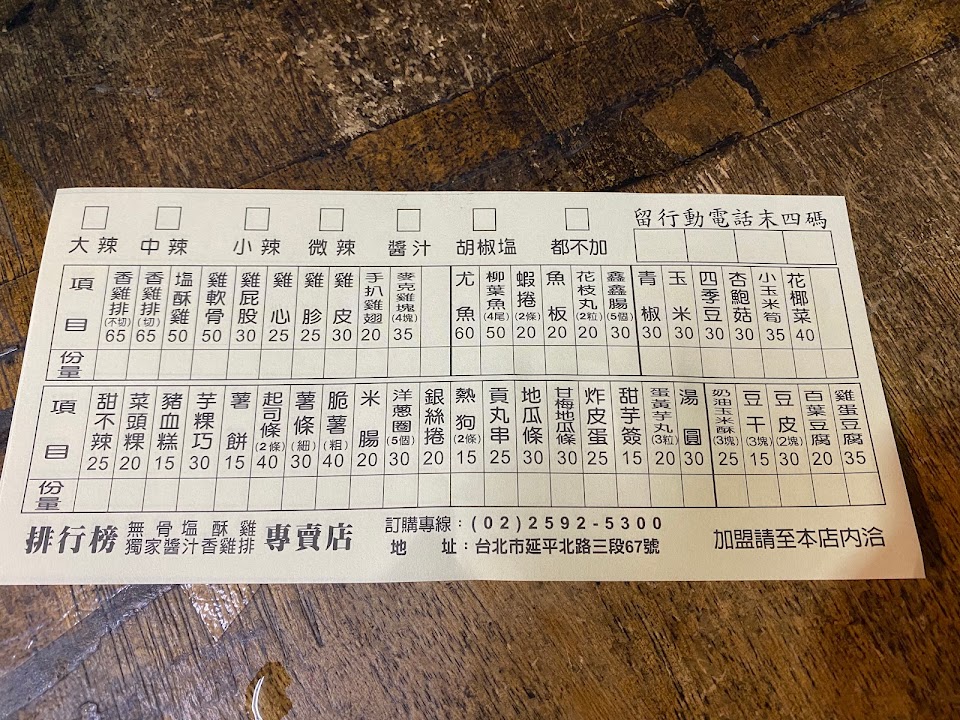 唯獨是老闆一人獨撐天下,要炸又要備料,所以可能是需要等一下,但老闆已經努力埋頭苦炸了,攤位前有單子,自行劃單後留下四碼,等老闆叫號~週三和週六休息!