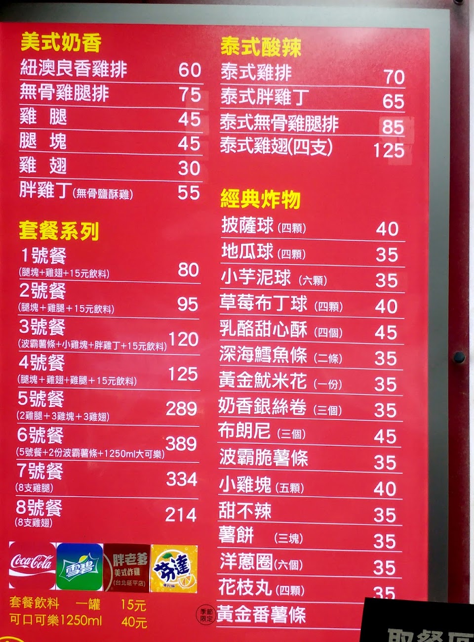 用熊貓點了一個3炸雞3翅2腿餐.10:24付款完成.10:39熊貓送達。 嗯..貴公司是製作最快的一家。 肉質又乾又澀.胡椒沒有辣椒沒有.吃那麼多家胖老爹口感史上最糟.一桶300多. P.S回炸過真的是爆難吃.請勿踩雷
