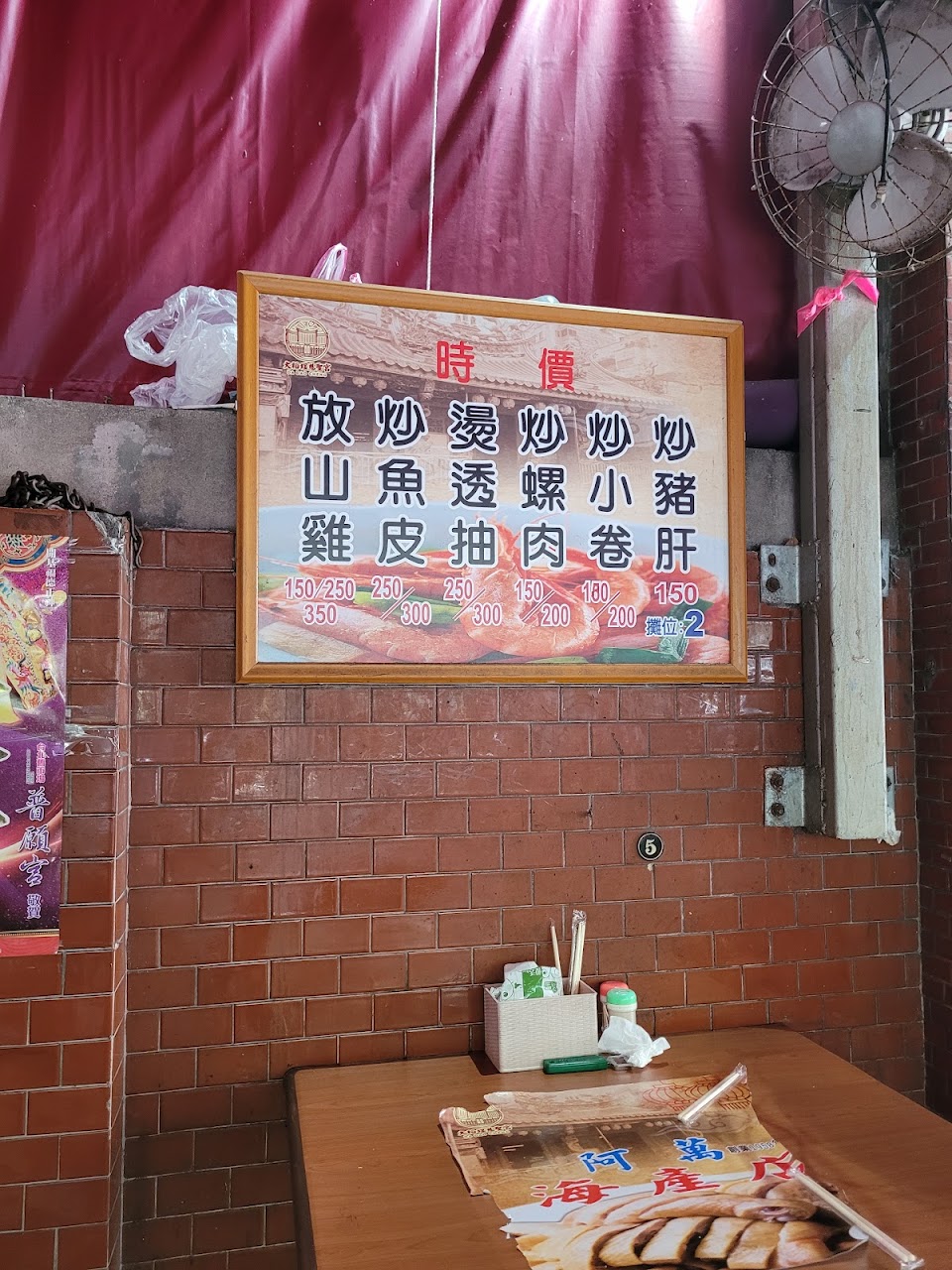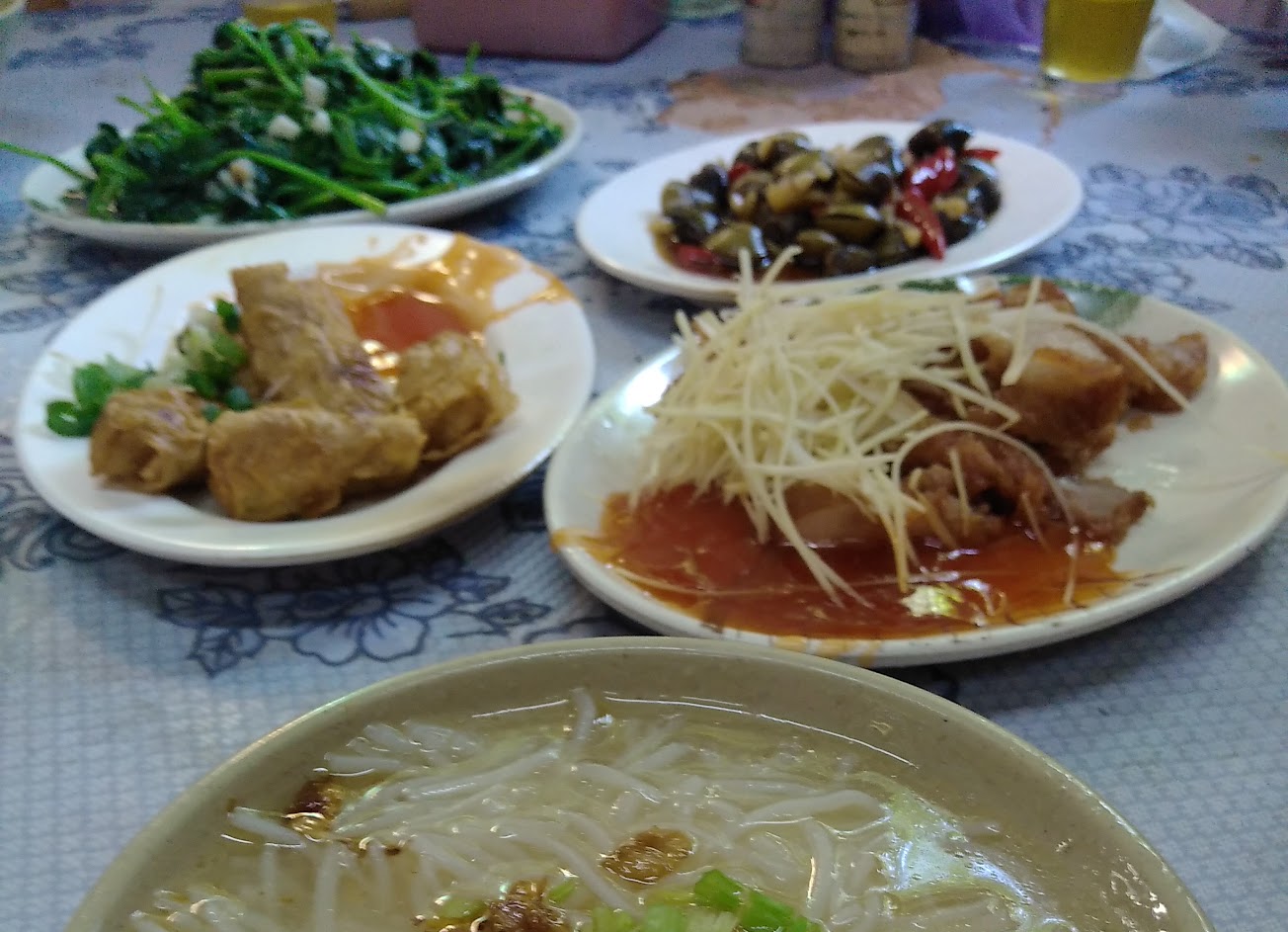 位在大稻埕慈聖宮廣場前方右手邊,白斬雞半隻$350、炒地瓜葉$80、紅燒肉$50、蛤蜊湯$100、配上白飯,3個人吃的很開心,這裡對環境不挑剔的人,挺物美價廉,夏天不供應米粉湯,有各種魚的料理。