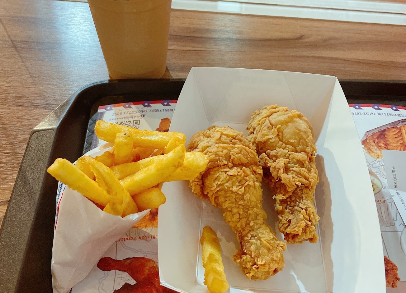 星期五的晚上,人不多,不用排丶餐速度快。 終於吃到鼎鼎大名的炸雞,兩個雞塊配上薯條跟飲料。$160價格中中。