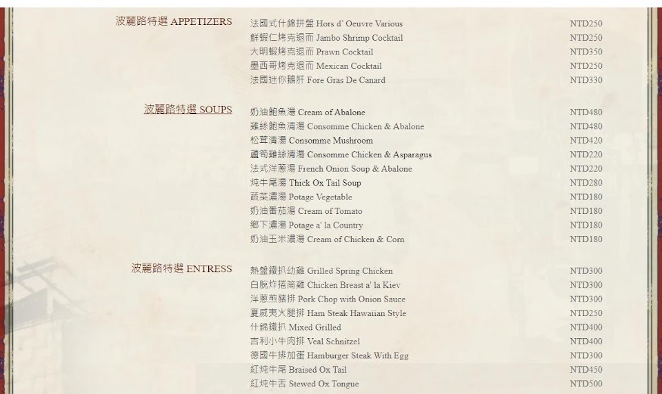 老字號 西餐廳 來體驗一下台北真正老餐廳的魅力!不會讓你失望的…不過價格我認為稍稍偏高…因為目前台北市區高檔牛排館競爭多…這個價格如果加一點就有很多選擇!但是老西餐廳有他獨特的味道!服務也不錯…還是很可以的