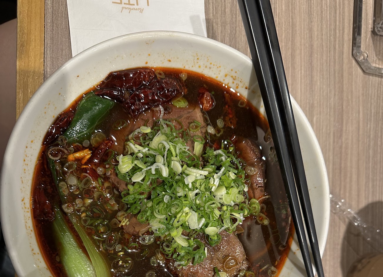 紅燒是醬油那種台式湯底,番茄喝起來超濃!有點像稀釋的番茄醬汁?牛肉非常多,至少7-8片,本來還嫌棄麵的份量有點少,看來預算都在肉上了。(但我比較想吃麵嗚嗚)