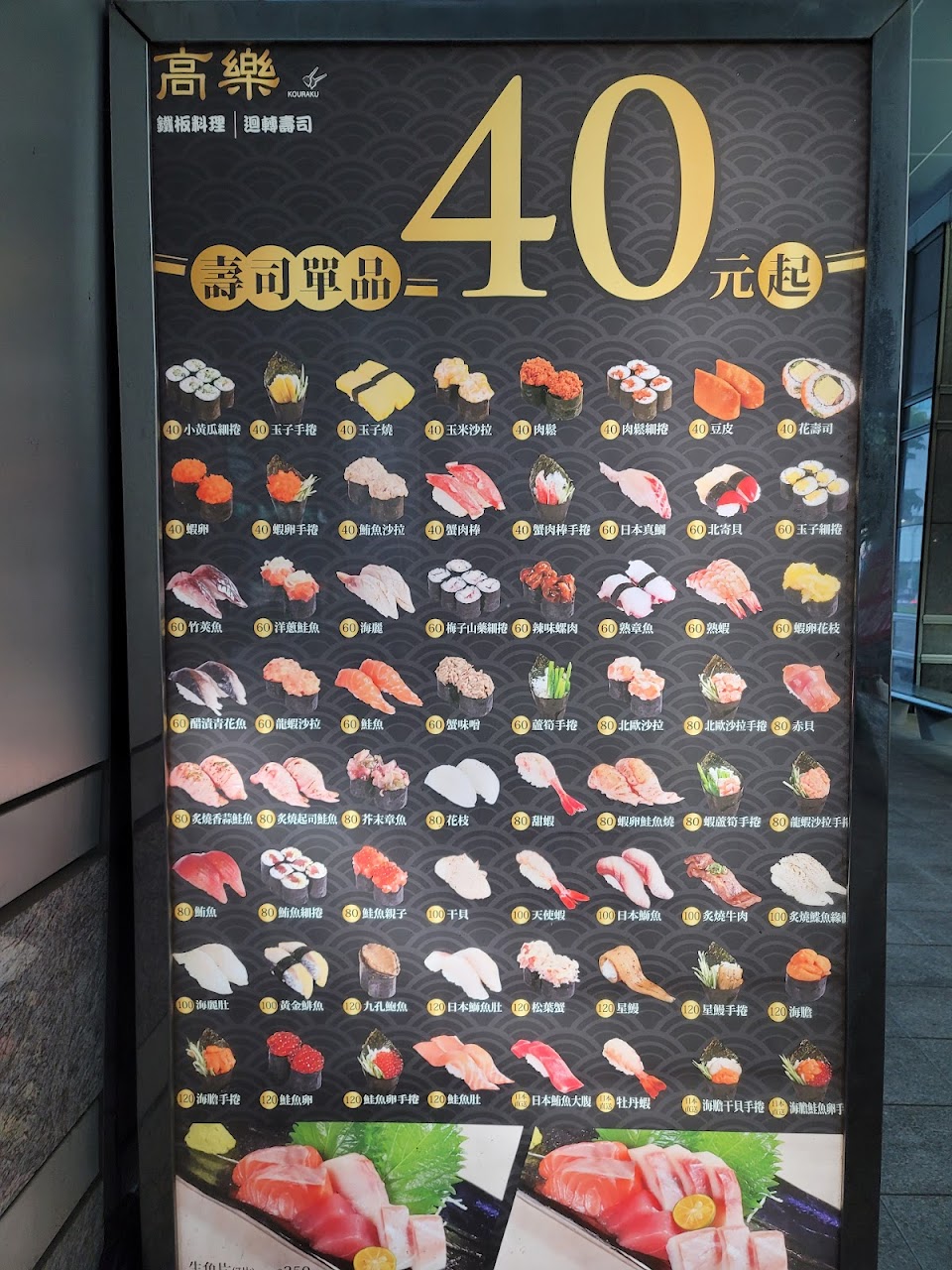 高樂的菜單,品項非常少而且毫無特色,價格比迴轉壽司高,但好吃的程度還不如其他迴轉壽司