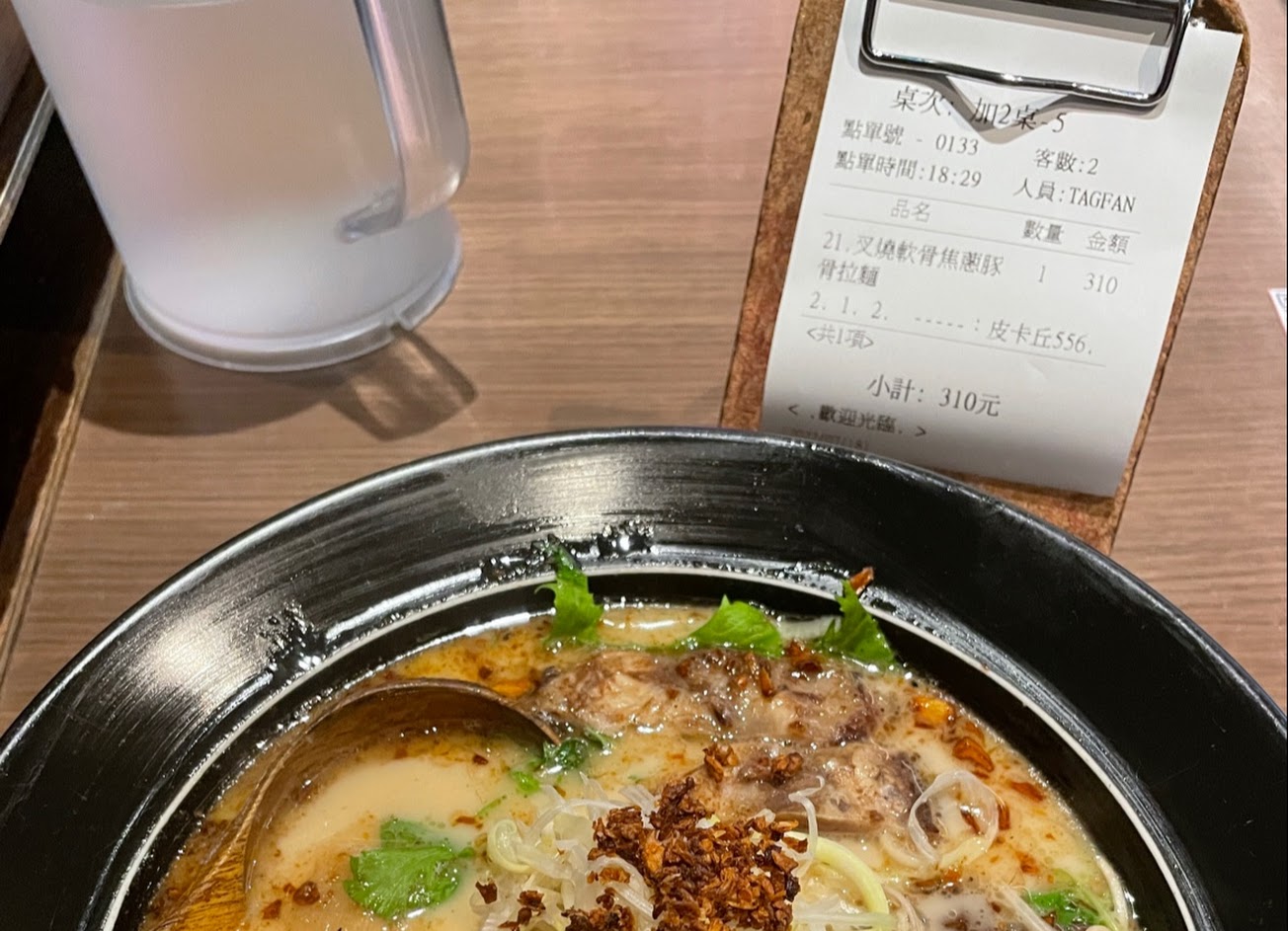 很久沒來吃了,現在點餐需要用手機掃描QRcode 做線上點餐,不知道沒有手機或網路的客人要怎麼處理,點了叉燒軟骨焦蔥拉麵,麵跟湯頭都不錯,軟骨也煮得很軟,只是肉吃多了有點膩的感覺,下次也許只點焦蔥拉麵就好。