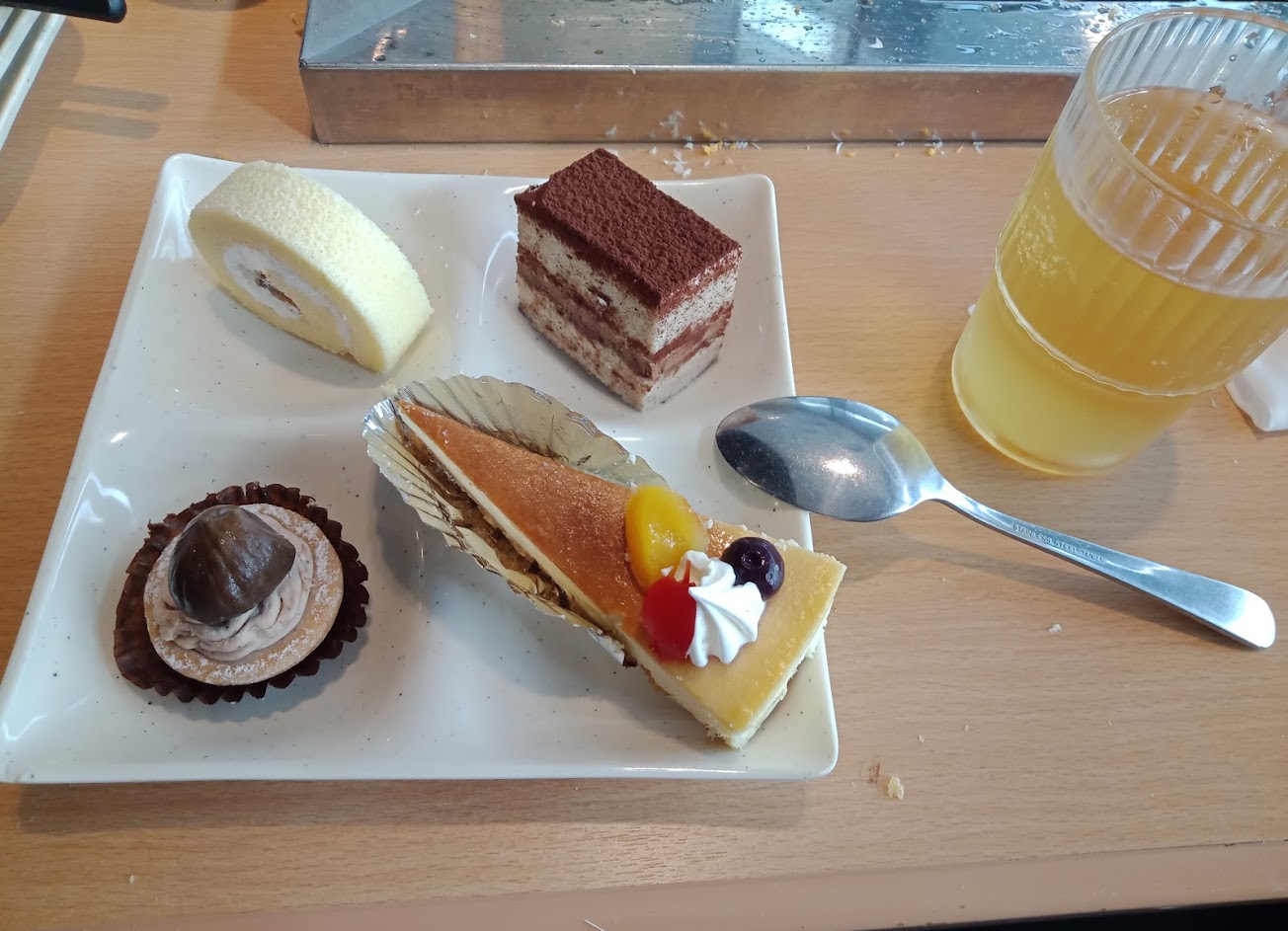 服務很親切補料也非常的迅速, 還有鮭魚炒飯、咖哩飯、日式炒麵 、番茄義大利麵; 飲料應有具有, 啤酒等酒精類飲料任你喝到飽。 飯後還有多種小甜點、水果,小心吃到撐!