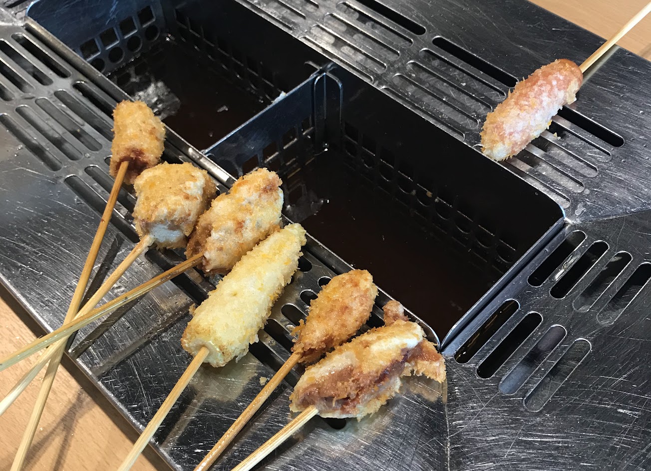 疫情期間無法出國,懷念大阪的元祖串炸物就得吃這家。 全部90分鐘吃到飽,連醬料都跟日本味道一樣,還多了多種醬汁如柚子醬可以選擇,以價格來說非常划算哦!還有日本啤酒免費喝,唯一差別就是全部食材要自己炸,時間要拿捏好別炸太久乾掉。 食材與日本差不多有牛肉、豬肉、培根、雞胸、雞腿肉還有海鮮、蔬菜、菇類都可以進去炸。 每每吃完都有一種滿足感。 唯一缺點就油煙味比較重多天散不去,還有跟日本一樣用餐時間到會準時提醒臺灣人應該不是很習慣哈哈