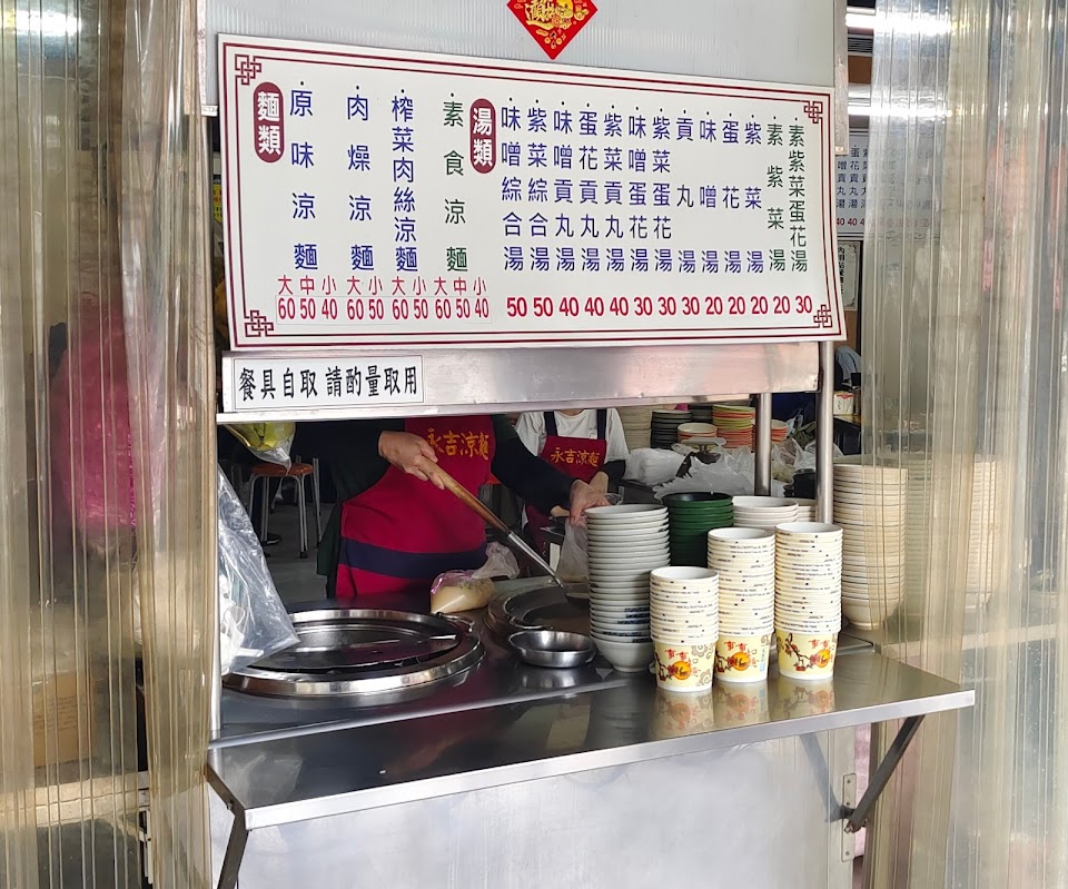 日前偶然路過看見某家店外大排長龍,原來是外帶『永吉涼麵』的人潮,見內用尚有空位,於是就趕緊點餐嚐嚐! 涼麵有四種選項,湯類就是味噌、紫菜、蛋花、貢丸的混搭;個人建議涼麵就選《原味》即可,《肉燥》口味並無特別之處,《味噌綜合湯》一次滿足三種口味! 店內的用餐環境稍嫌不佳,送餐人員應避免手指碰觸到餐點!