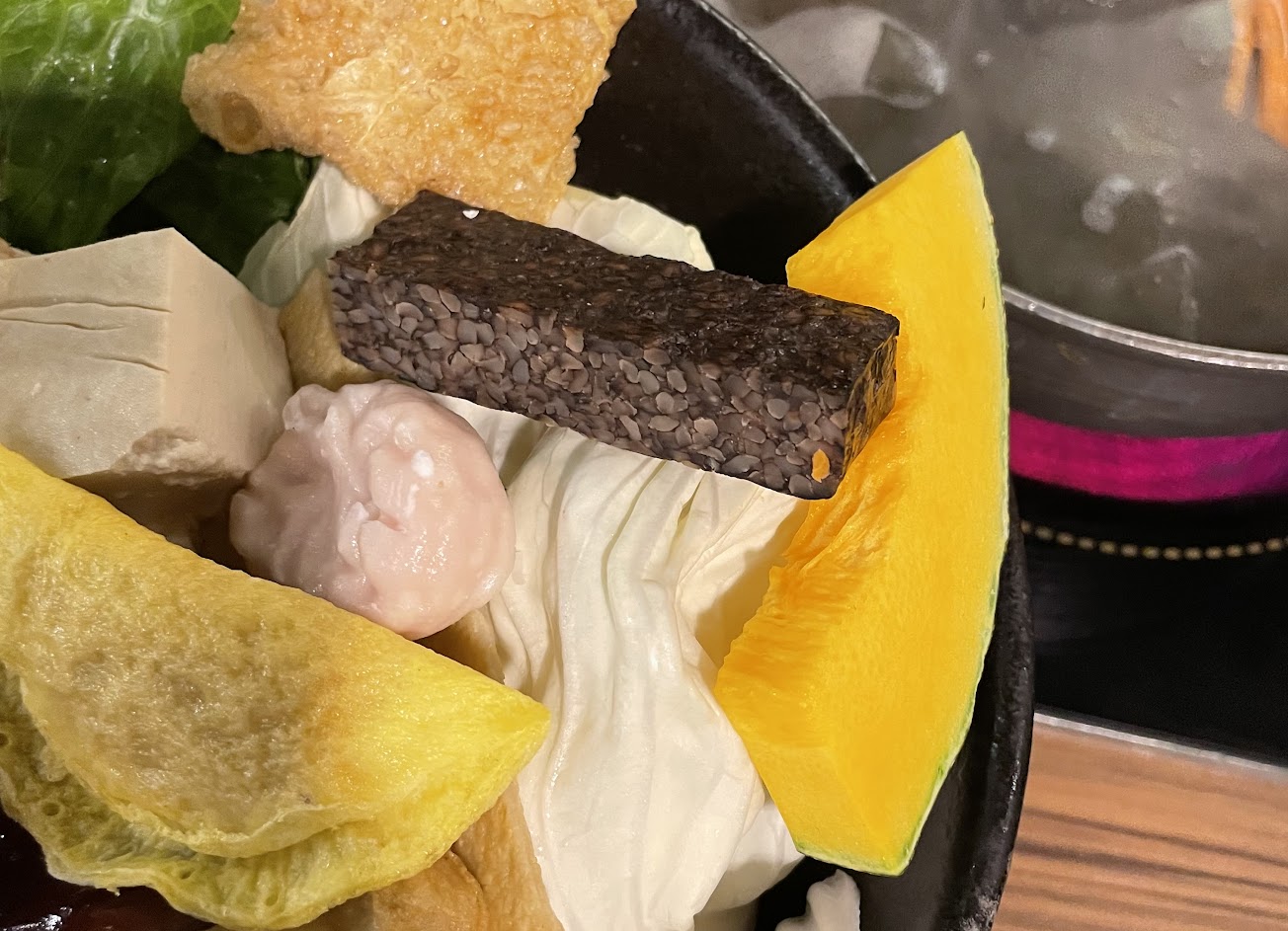 菜盤的火鍋料不多,且蔬菜都還還算新鮮,這點值得肯定。然而食材似乎沒有符合這個價格的水準。例如玉米乾癟水分跟甜味都不夠,蘿蔔的香氣也不太夠,如果矇著眼吃會以為是大約200出頭涮涮鍋的食材。