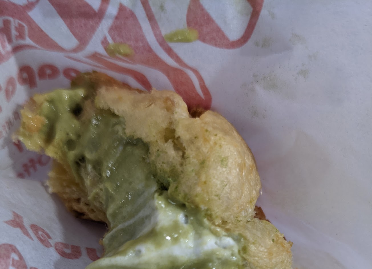 點了期間限定日式抹茶泡芙,咬下去吃不到抹茶味,一看居然是綜合口味,不知道混的是香草還是鮮奶,混出來的口味也不OK。 點完餐就站到旁邊沒有注意製造過程,不知道是擠奶油袋的內餡有問題,還是店員做到一半發現做錯再灌抹茶奶油,總之這個品管明顯有問題? …
