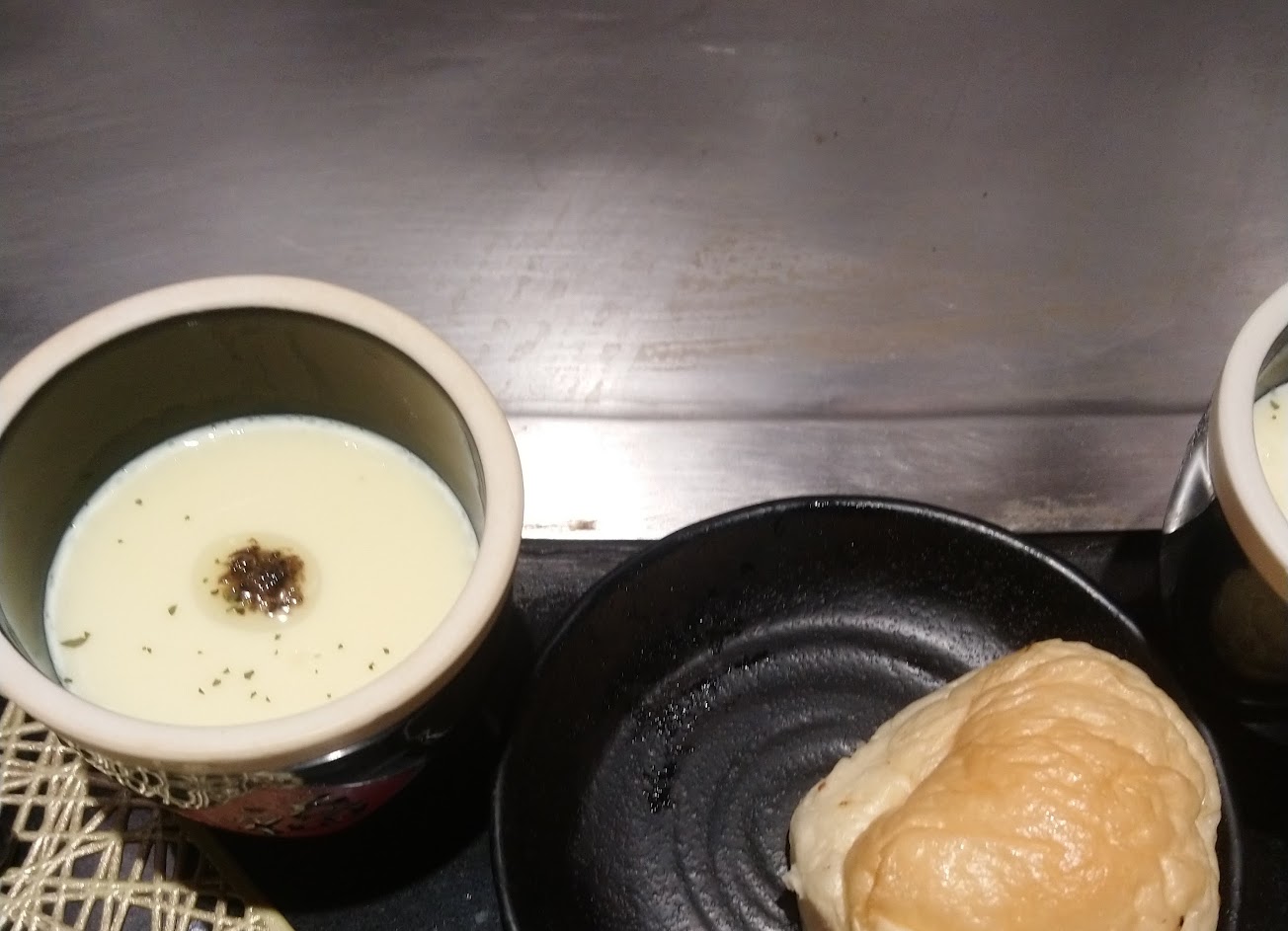 會想再訪的鐵板燒,牛排主餐和配菜都還不錯,加39元的碟魚也煎得很棒,唯一的敗筆就是太白粉勾芡的玉米蛋花湯了。真的是很多年沒吃過這麼「透明濃厚」的湯,希望店家太白粉可以省點放,顧客絕不會認為偷工減料的。 另外非常誠懇的建議負責端飯端湯的馬尾店員改變端湯方法,不要用大拇指扣在碗內的方式將湯送到桌上,讓指尖距離湯的表面在有碰到和沒有碰到之間。建議改成抓娃娃機爪式從上方扣住邊緣,免得指甲燙到。
