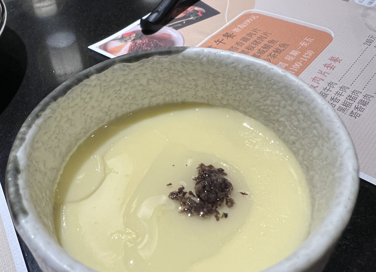 我點了塔香羊肉片套餐240$+79炒花枝,剛坐下就先送上一碗熱的蒸蛋,味道單純,但是暖胃。