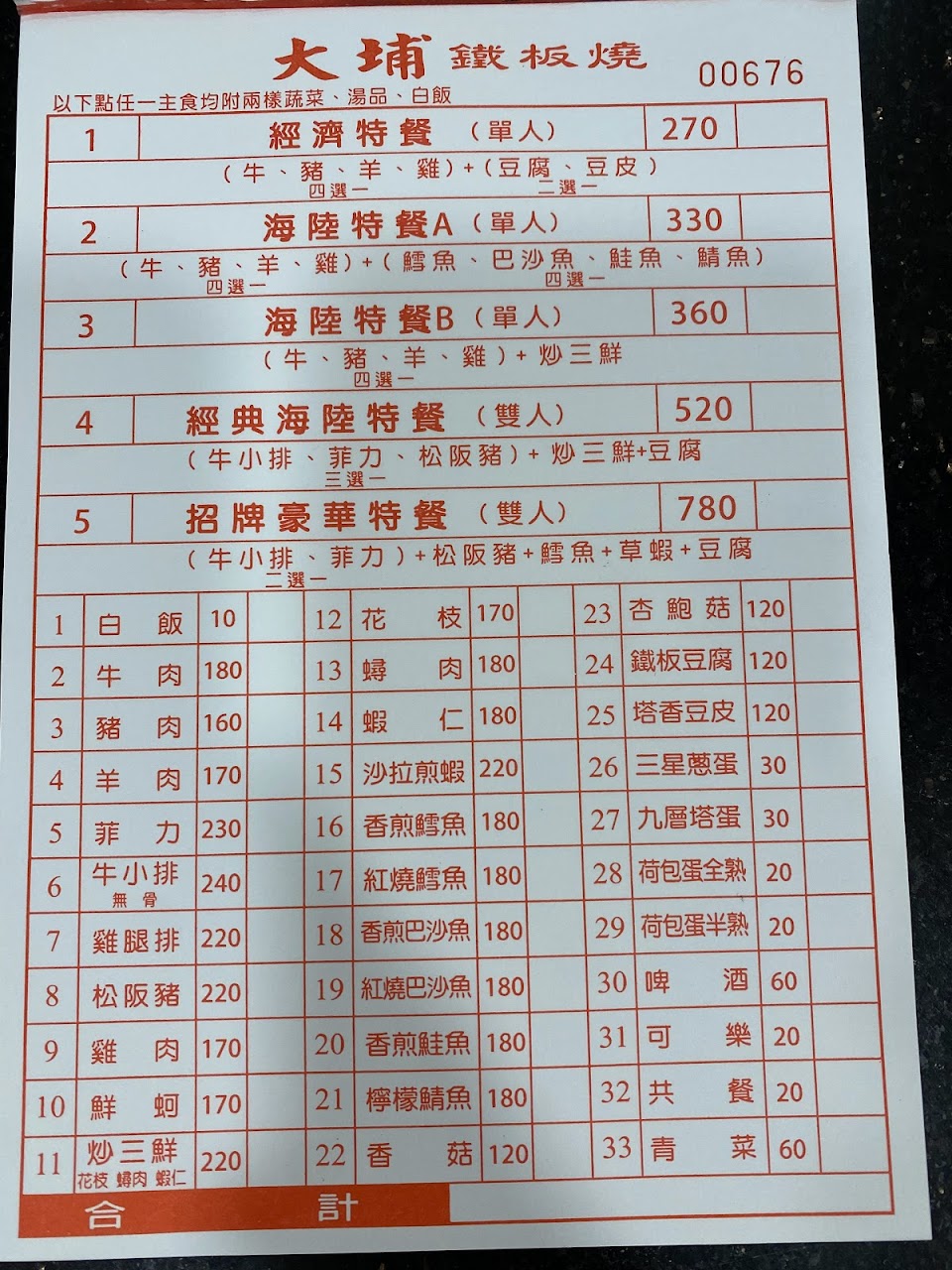 2024最新在地推薦餐廳的菜單_大埔鐵板燒 五分埔店的菜單、圖片