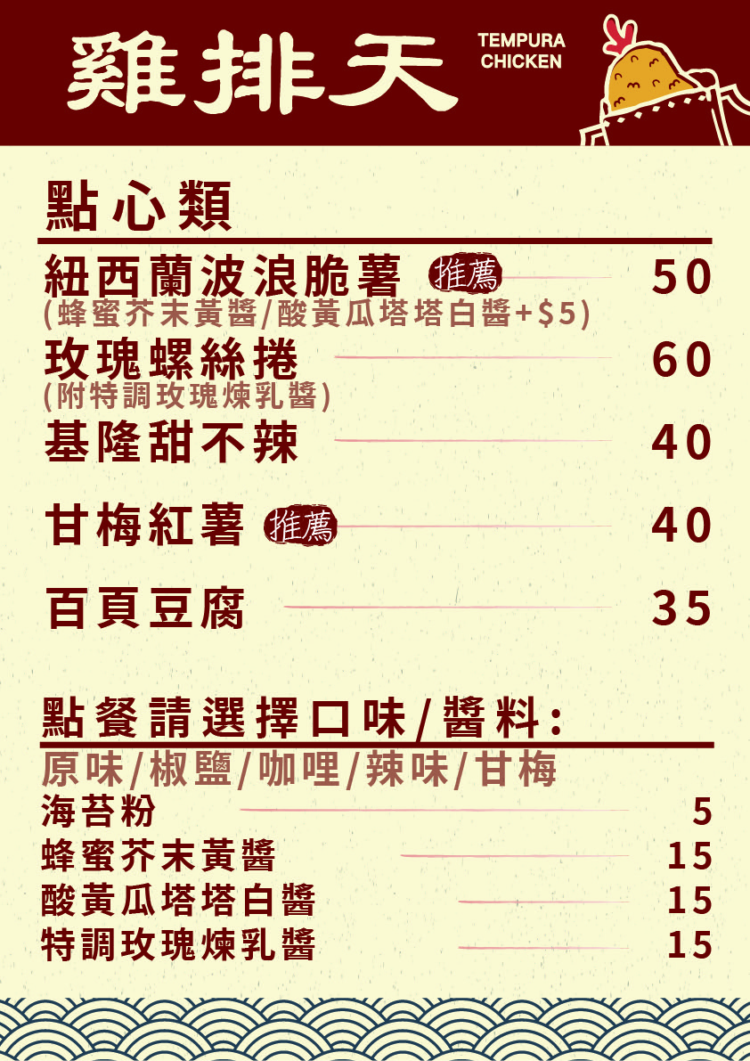 餐點並不多元,但是內容都很獨特, 建議吃膩其他家的炸雞小吃,可以來雞排天換換口味唷