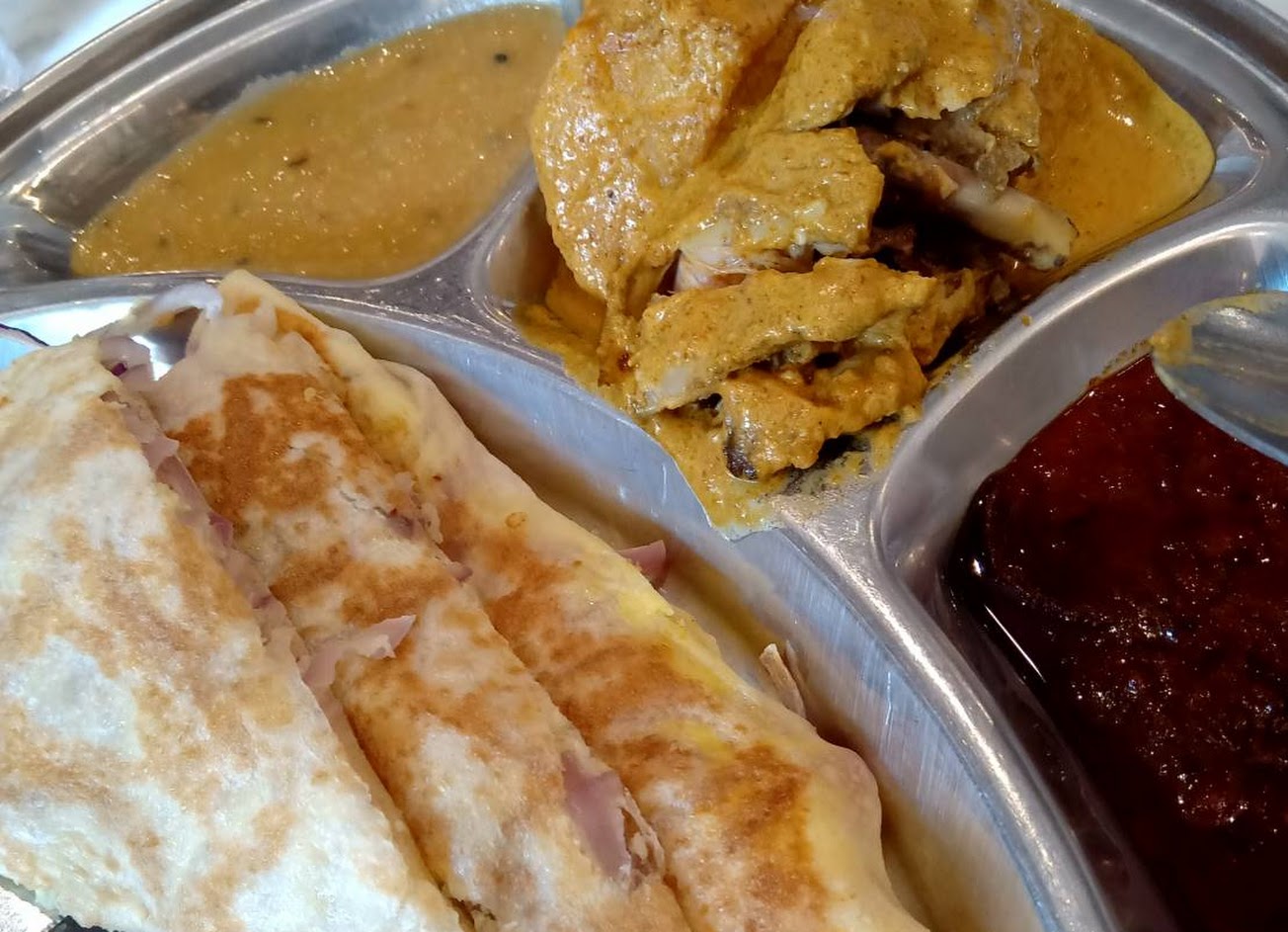咖哩雞很夠味、帶內斂有深度的辣,拋餅配搭洋蔥蛋很恰好、洋蔥與蛋比例讓餅帶有食材甜味多吃卻不膩,營養很足。圖中餅有四切片,吃了一片才想起拍照,雞腿肉嫩入味,肉與骨分離。
