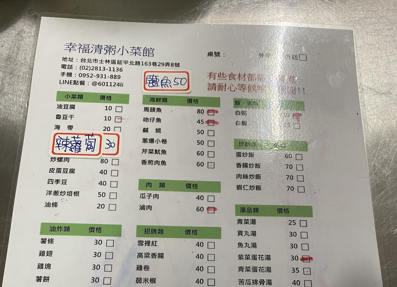 這裡沒有光鮮亮麗的招牌 也沒有琳琅滿目的菜盤 更沒有譁眾取寵的裝潢 有的只是闆娘的誠意 以及台北少有的人情味 這間店存在的價值 已遠遠超過顧客們追求的CP值 請珍惜這樣在台北為數不多的好店 與其人參貂皮烏拉草 不如幸福清粥吃到飽