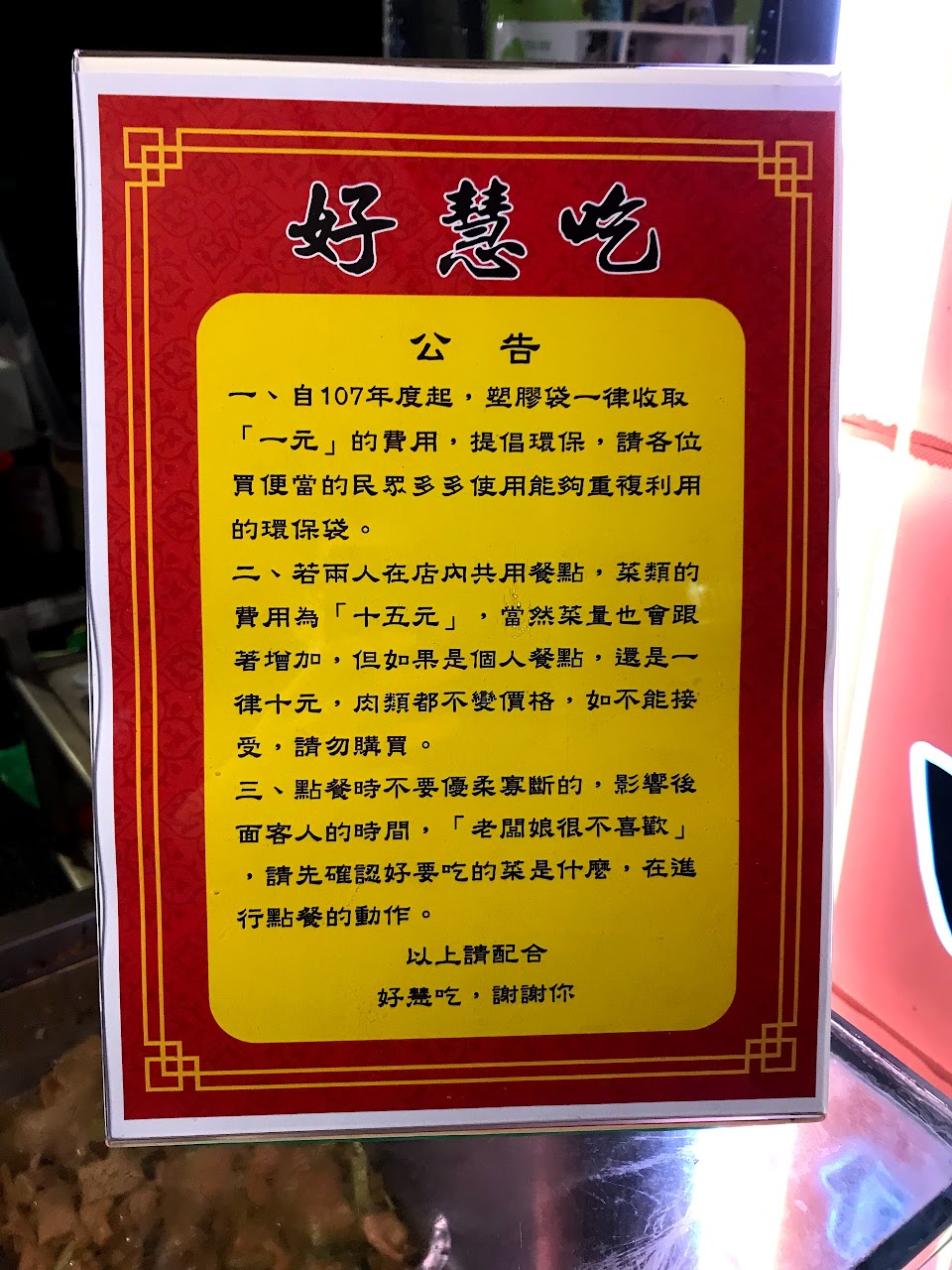 菜色很多樣,味道也不錯,有便當也可配地瓜粥。可惜菜都有點太油,點滷雞腿要小心沒熟透。而且老闆娘不喜歡客人點菜時優柔寡斷,公告有寫你要看!!!選菜的時候要先想清楚要幾樣哦!營業時間到凌晨,是宵夜族加班族的好朋友,休息時間不一定,也是要看老闆娘的公告。