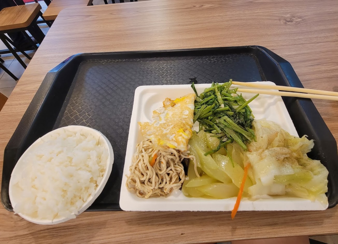 店員夾了份量超少的兩樣青菜加一顆荷包蛋