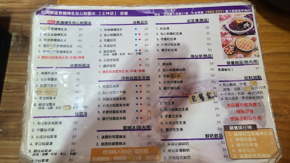 販售焦糖煉乳冰、豆花、仙草凍、雪綿冰、芋圓蕃薯圓、包心粉圓、焦糖煉乳、紅豆湯(熱品)