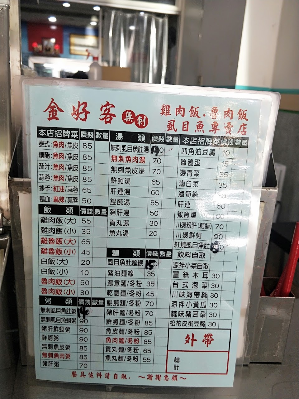 「好客」雞肉飯?因為缺了甚麼就用甚麼命名是嗎,剛搬到附近來探探環境,3/5約下午六點第一次來不清楚菜單位子為了聲“不好意思請問菜單在…”,話還沒說完就被店員凶“在抽屜!”,沒關係,看您們在忙外帶訂單想來是不需要來店客也賺的盆滿缽盈了,是我打擾貴店~ 會轉知士林的同事朋友們貴店熱誠的服務態度?