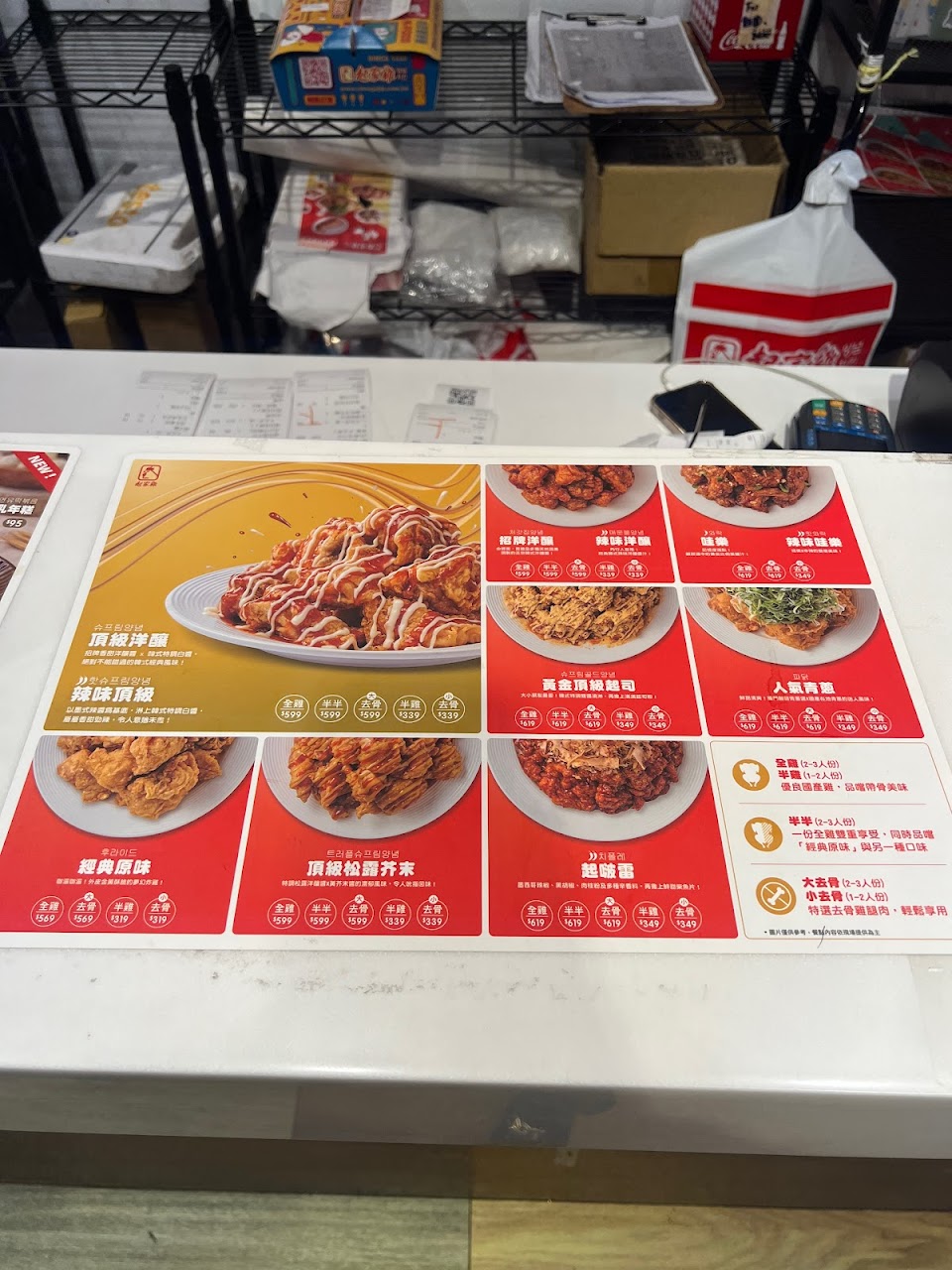 第一次購買,在店內等外帶大概20分鐘左右吧,買原味+辣味,覺得原味普通,韓式甜甜辣辣的還不錯,但如果對完全不吃辣的人來說會很辣,怕顧客吃的太油膩,盒子裡面還有附一包醃蘿蔔搭配,還有一罐小罐的可樂,本來想在現場加購大瓶可樂但是一瓶80太貴沒買,但多買了貴貴的90元薯條但還算好吃只是價錢真的貴,現在下載app有送一個帆布袋!