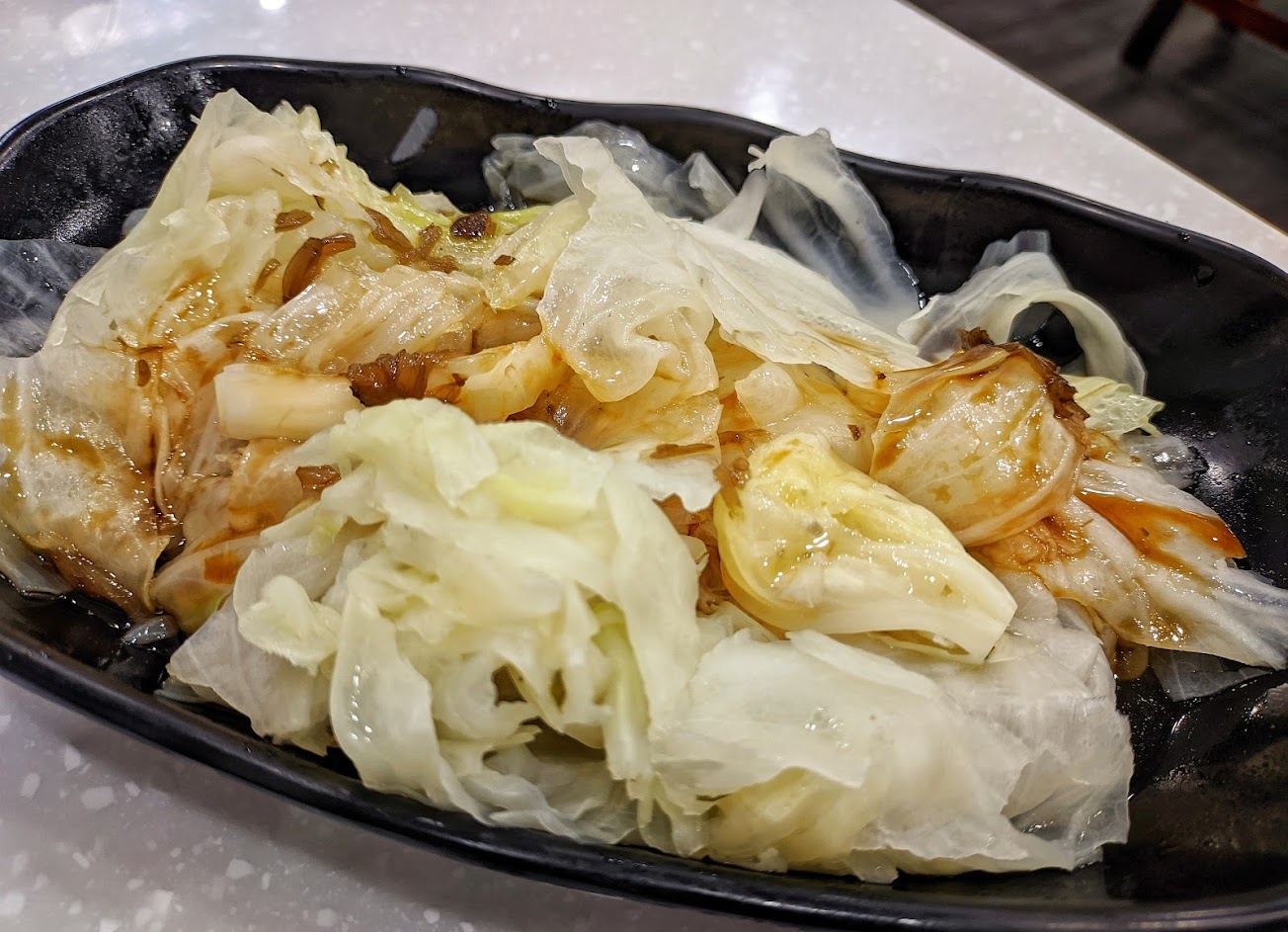 燙青菜是成本低廉的平地高麗菜,水煮起來沒味道所以加重鹹的調味,跟雞油飯加醬油膏一樣口味低級。