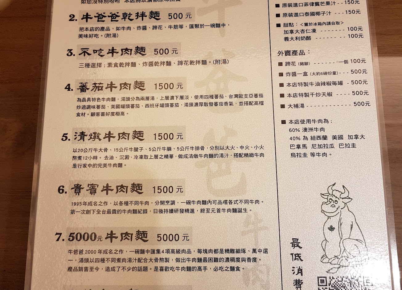 牛肉吃起來不錯,但是麵煮的太爛,湯鹹到一個不像話,價格根本亂訂,一碗牛肉麵居然要緊500$。。。 就連易開罐的雪碧外面一罐只賣20~25,這裡居然賣一罐50 …… 可以去告嗎?