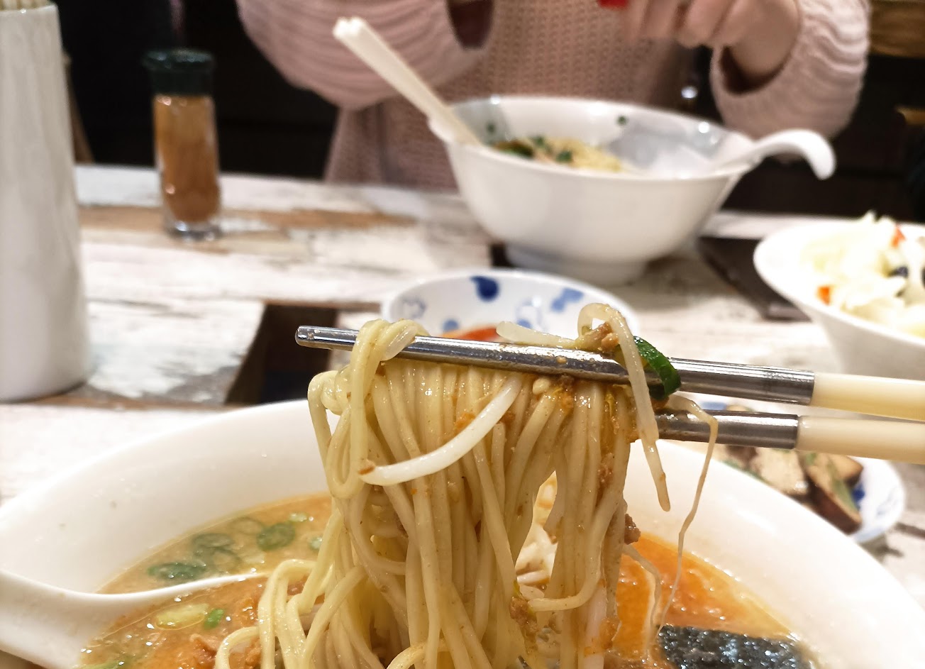 週末12點抵達,12:50用到餐。發現不是因為位置不夠是服務人員不夠所以排隊較長(入座後發現右近一半的空桌)點了兩碗麵,口味不太習慣,會覺得是比較台式的拉麵。