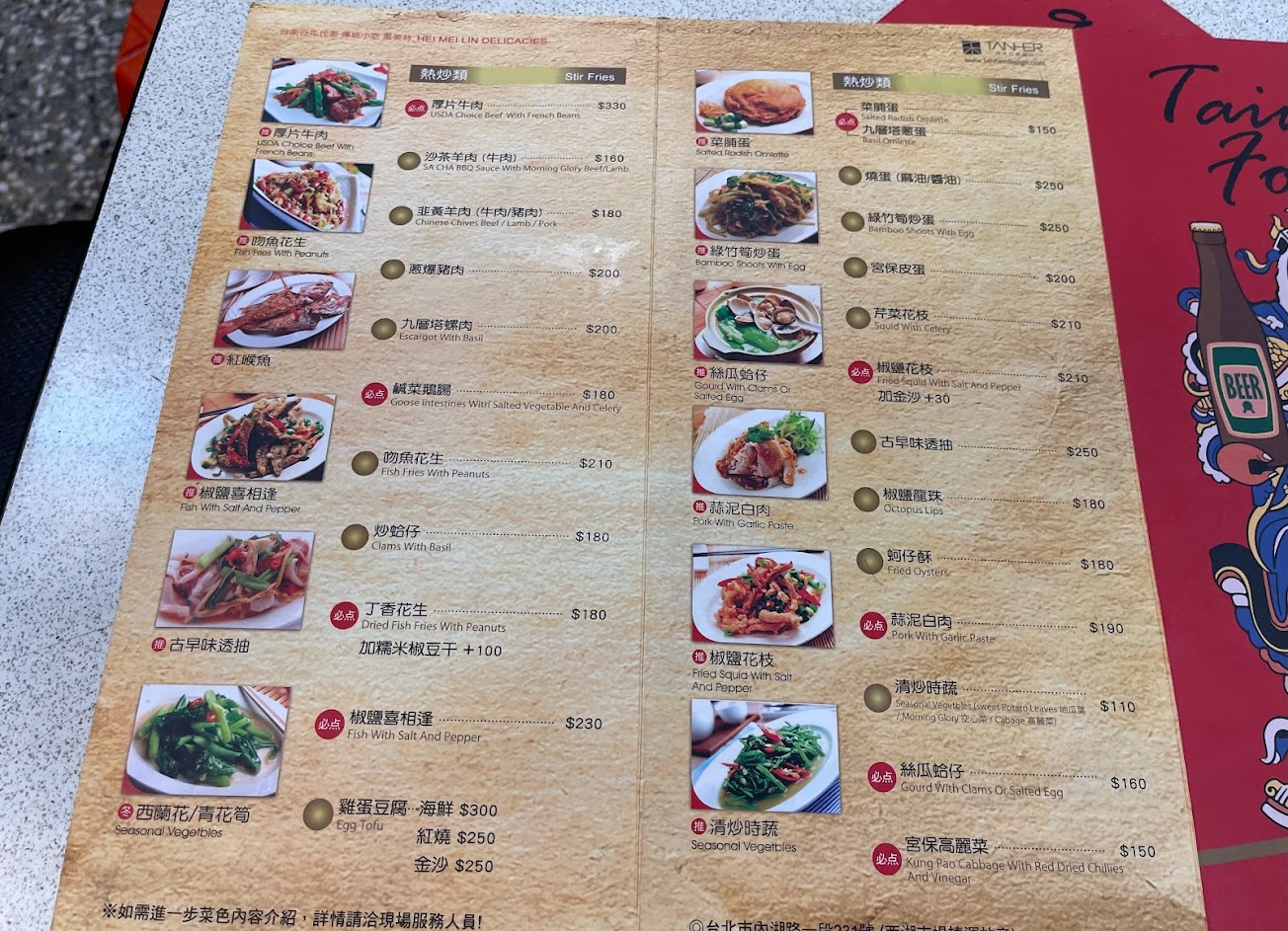 黑美林不用多說,大家都知道讚! 時隔多年再來訪還是覺得讚到爆! 首先店員態度非常好,仔細介紹菜單但也不會強迫你點,讚爆! 再來就是各種菜的介紹,因為實在太開心,點了13樣菜(含滷肉飯擔仔麵和湯) 1. 西蘭花 -除了媽媽炒的,沒吃過這麼嫩的西蘭花,看似平凡但味道很剛好又很鮮甜! 2.滷豬腳 -好吃的豬腳就是黏稠但不油膩,吃完嘴角還會黏黏的 3.擔仔麵 -這道我個人擺在比較後面才吃,但微飽的我還是把剩下半碗直接秒殺!湯頭甜而不膩,麵條軟硬適中,豆芽和麵的比例適中,讓人一口接一口停不下來的美味!可以單點外帶 4.滷肉飯 -味道十足但又不會死鹹也是可以秒殺的一碗好飯! 5.鵝肉 -這盤鵝肉不der撩啦!肥瘦非常剛好,每一口都非常juicy!重點價格合理實在! 6.九層塔蔥蛋 -因為太多菜太驚艷,它只能淪為配角,但也是蔥料滿滿,香氣十足! 7.椒鹽喜相逢 -平常不太能吃炸物的我,忍不住吃了第二條,跟平常鹽酥雞攤的差非常多,油溫火候控制的很好,整條吃起來,粉薄香脆又不油膩! 8. 炒海瓜子 -這道是我吃過最好吃的海瓜子,運氣好剛好老闆這波挑的海瓜子都很大顆,跟一般海瓜子肉扁的口感完全不同!愛死! 9.烤香腸 -黑美林的招牌必點必吃,肥瘦非常合度,做成禮盒送人真的是新年不失禮的好選擇! 10.烤虱目魚肚 -魚肚肥瘦剛好,煎功也是非常了得,背面夠脆正面不老??? 11.胡椒蝦 -泰國蝦肉q彈夠新鮮,胡椒份量也足夠,非常夠味! 12.魷魚螺肉蒜 -魷魚、螺肉、蒜苗,都沒在手軟,滿滿的料缺又不失比例,料多到我們打包隔天繼續! 13.脆皮烤腸 -大腸外脆內Q彈,非常非常好吃?只是忘記拍了
