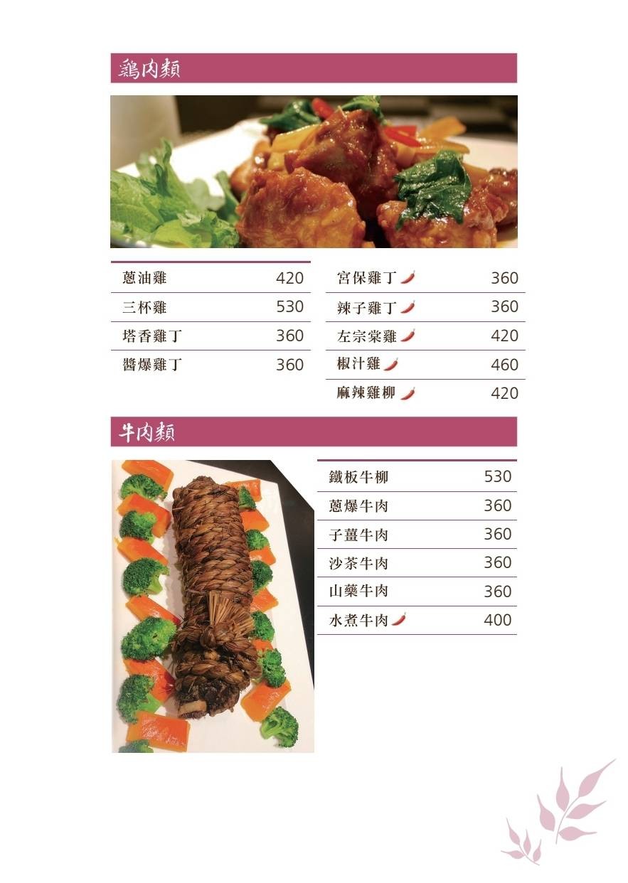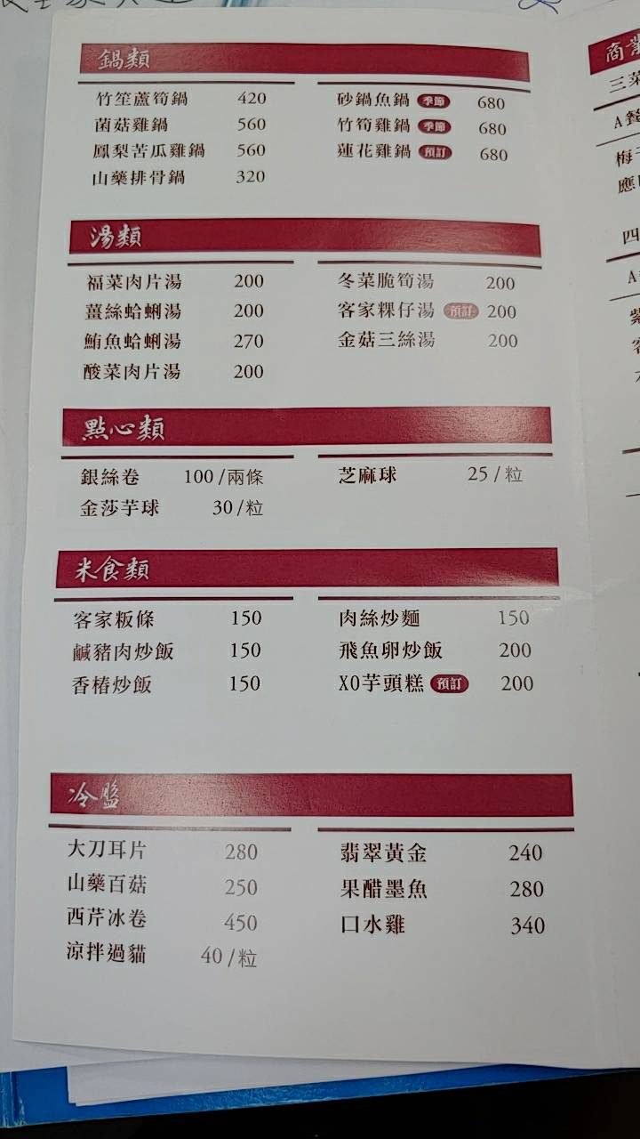 銀絲卷 口水雞 紫菜大蝦 梅干扣肉 蛤蜊絲瓜 芝麻球 旗魚芋頭米粉湯 五更腸旺 麻油蛤蜊炒松阪 客家小炒泡椒蹄花 薑絲大腸 炒龍鬚菜 酸菜魚 麻婆豆腐