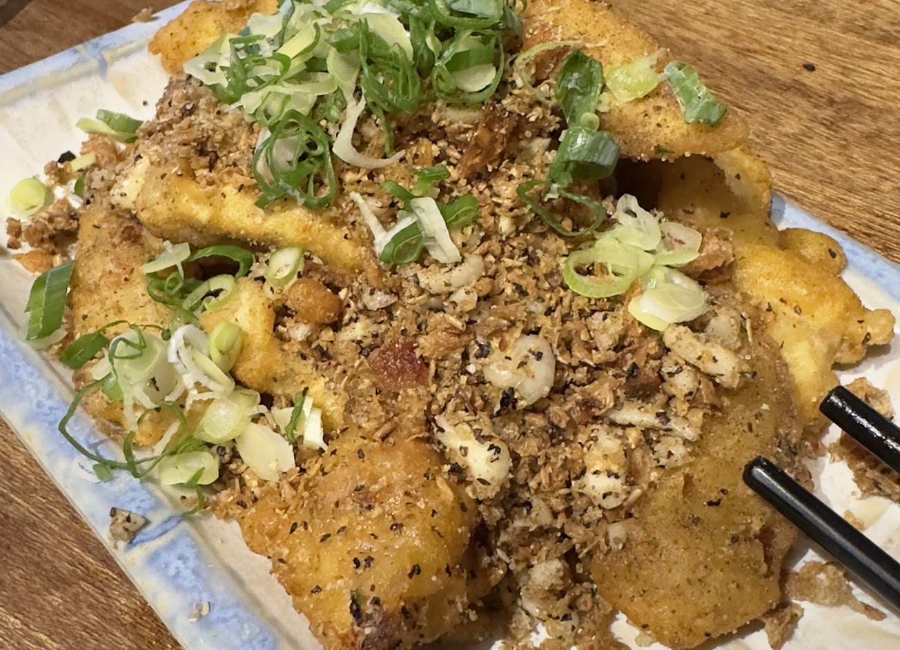 鹽燒雞肉串,薑汁炸豆腐,醬酥牛蒡