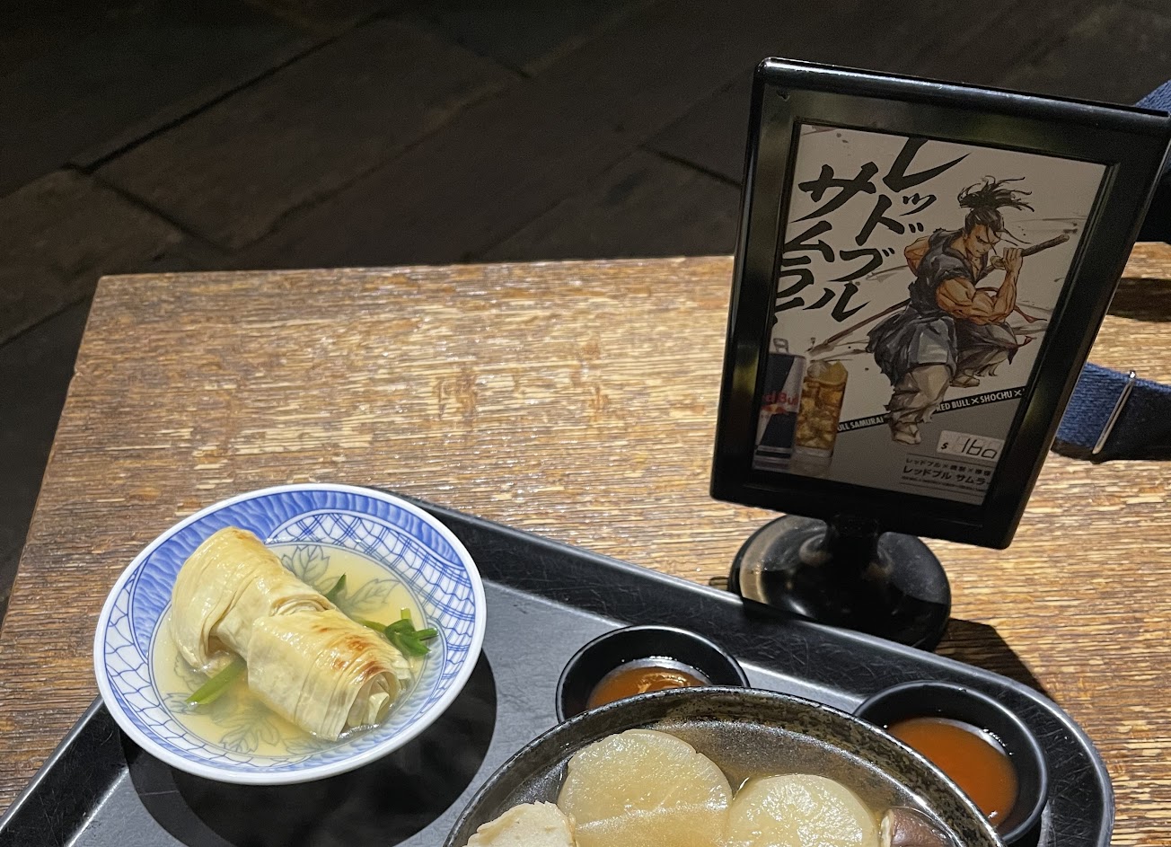 店內有多種酒類可以點選,食物以關東煮烤物為主。