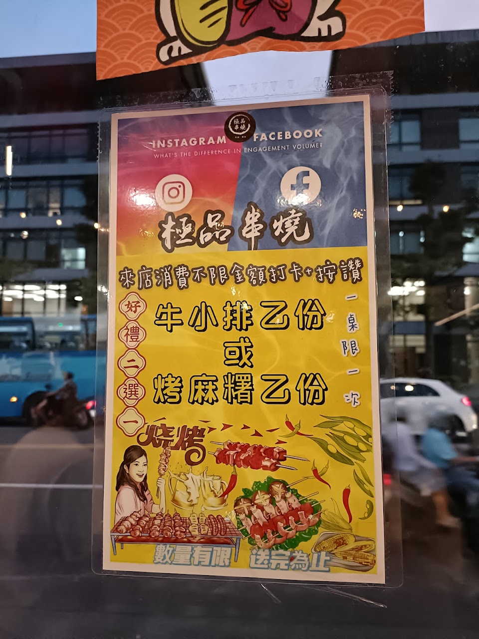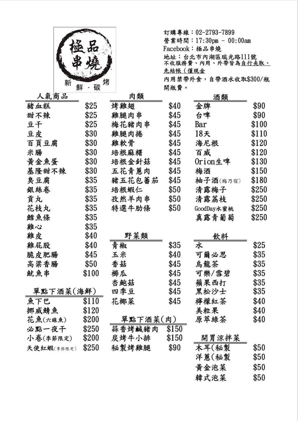 今天和兒子去極品串燒買些燒烤回去幫爸爸慶生,到店裡跟櫃檯小姐表示要外帶,我不知道是太早去了還是做了什麼不對的事,櫃檯小姐的態度實在很讓我傻眼,我不過問說肉串劃一條線跟二條線有什麼不同,妳跟我說上面有牌子自己看啊,重點是二條線的肉串有牌子寫的羊肉,但另外旁邊一條線跟沒畫線的就是沒標示我才問妳啊,有需要態度這麼的差嗎?之前剛開幕去了幾次感覺東西好吃態度也很親切,沒想到今天讓我感覺真的很不好,我想東西怎麼好吃,今後我也不會再想去消費了!