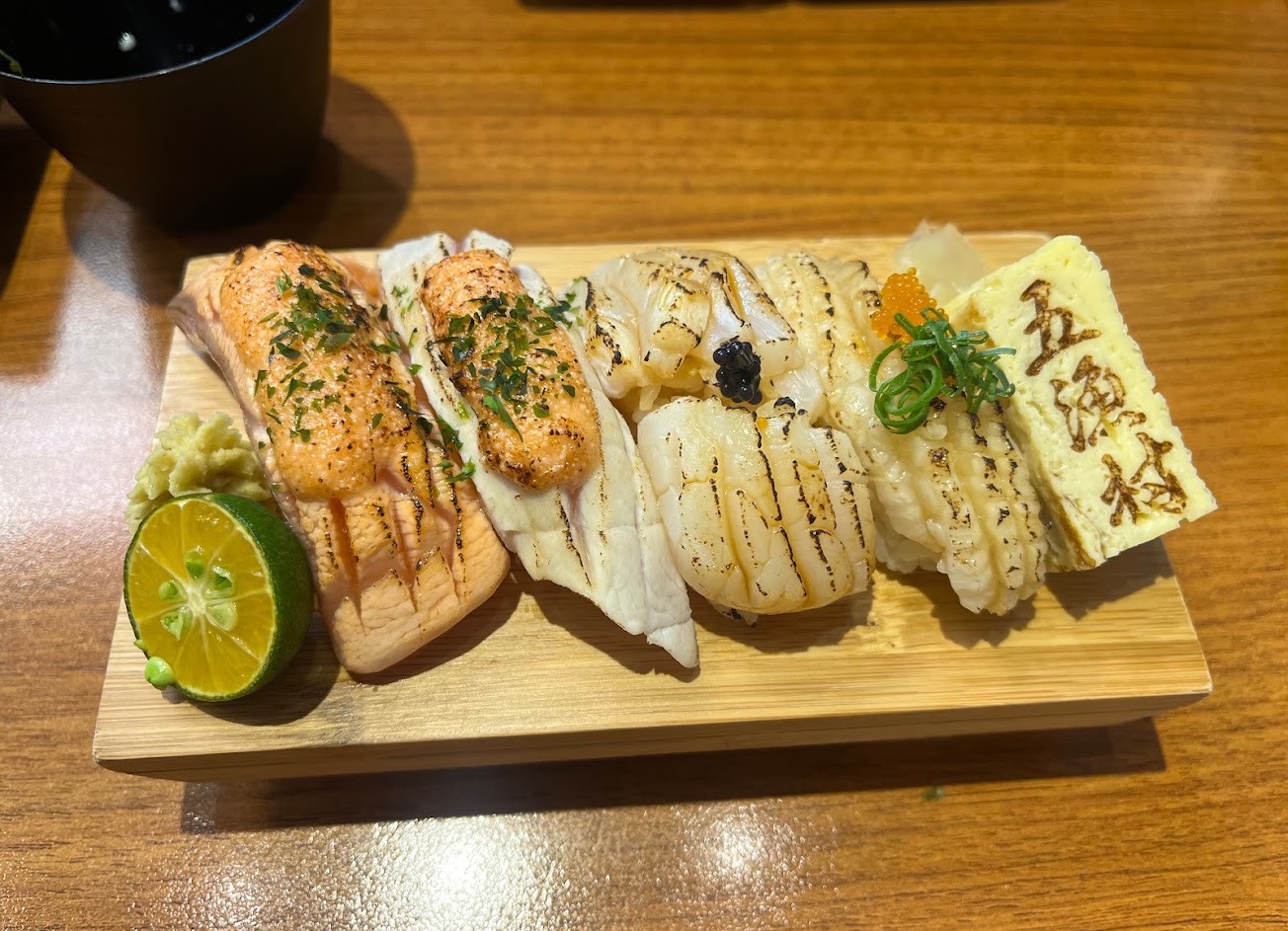 甜蝦新鮮味美,炙燒干貝香氣軟嫩兼具;隨餐附贈的味增湯也是鮮甜十足。用餐後面臨驟雨,老闆也親切地主動詢問是否需要雨傘。