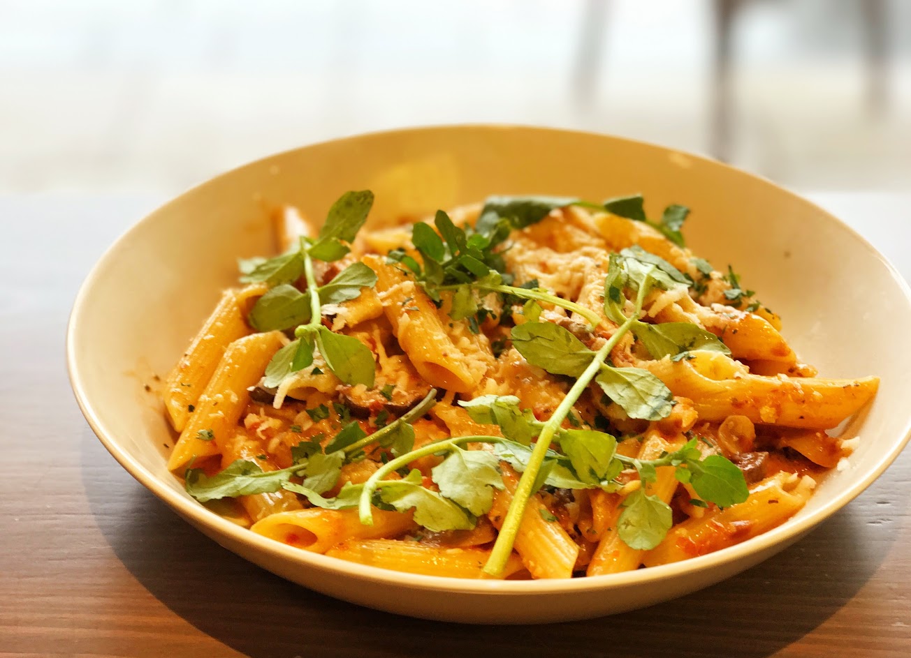 工業風餐廳,供應早午餐料理、漢堡和義大利麵等以健康為取向的餐點,另有果汁。