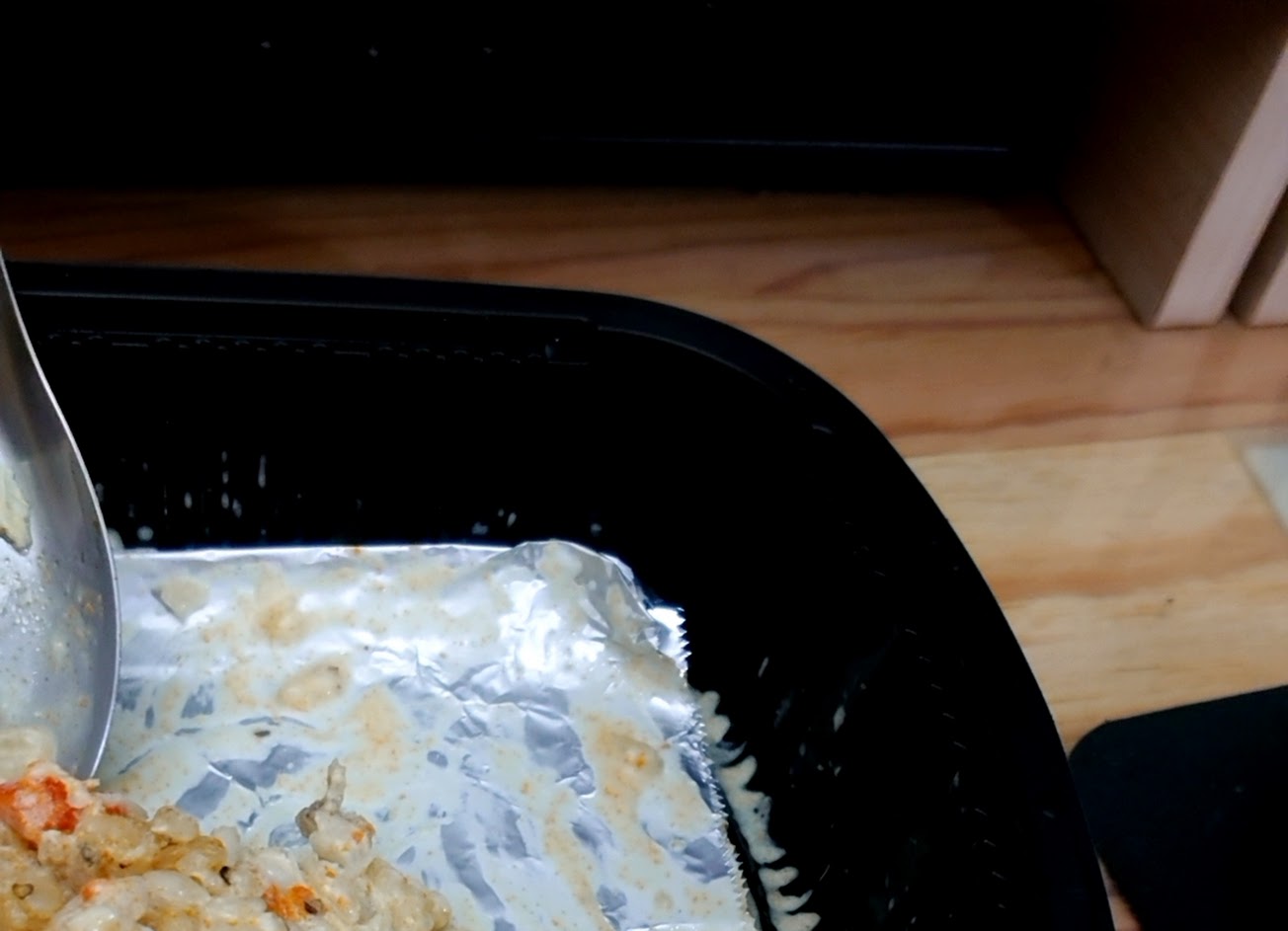 然後你們外帶餐盒比紙袋還要大,我只能抓蓋子,結果你們蓋子跟盒子連膠帶都沒黏,差點整個翻掉,很困惑的是餐盒底部還鋪了一張錫箔,米飯大概是想走一個義式米心偏硬的口感,但,最上面那層的飯是整個偏乾掉。