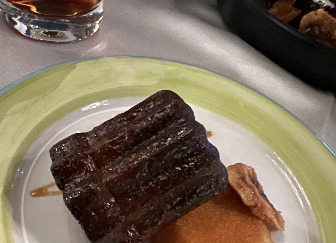 田螺相當好吃,只是希望麵包更多一點。 主菜點了肋眼牛排/松露薯條,牛排調味很好,有煎烤的香氣,但是我點五分實際吃起來卻是七分熟的口感,說點不好聽的是有點老了,但由於肉質與調味,還有沾著紅酒鹽很好吃,所以姑且還是可以接受。