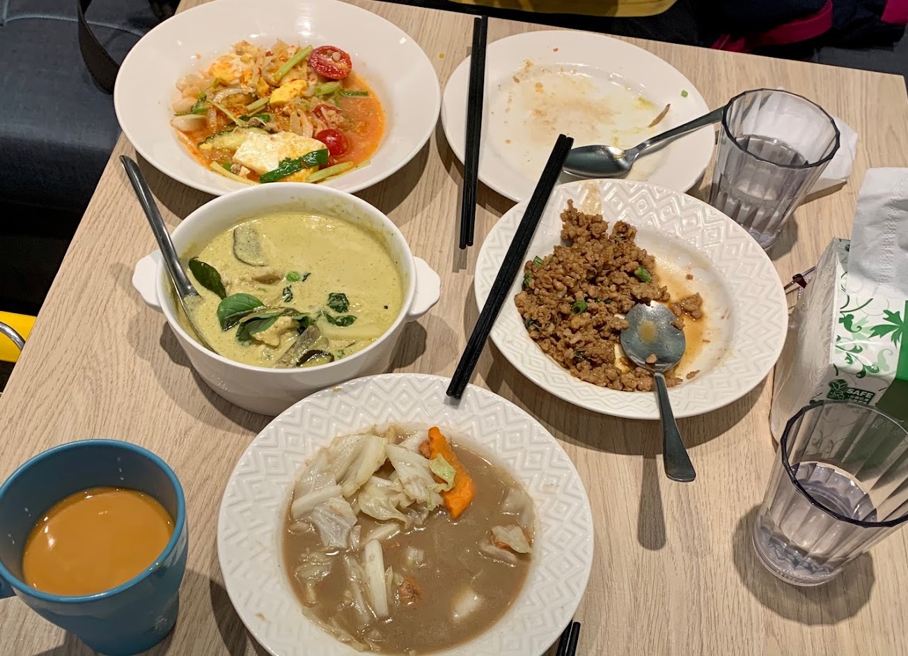 已經吃得快飽了才想到要拍照⋯⋯但真的非常美味!打拋豬肉不會過鹹或過甜;涼拌荷包蛋爽口又滋味獨特;蝦醬高麗菜鍋氣十足;綠咖喱對我來說太辣了,但還是忍不住吃了幾口。已經被消滅的椒麻雞味道單純,醬汁口味不算太重,是炸的恰到好處的無骨雞腿排。(若熱愛重鹹或辛香料的人可能會覺得口味不夠,但我覺得剛好可以。)