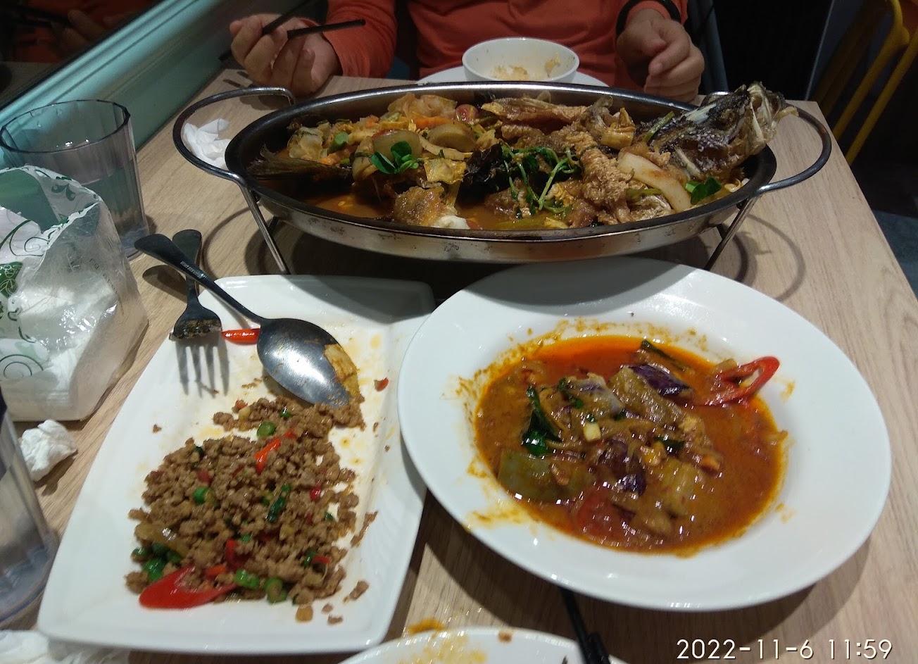 中辣的辣度很夠、味道都很不錯也都蠻道地的、涼拌海鮮沒有很多洋蔥、花ㄓ跟蝦料算多也是新鮮、蝦醬空心菜的空心菜很嫩、綠咖哩很肉片不會過柴、粉絲煲的蝦子口感有點微粉、唯一軟殼蟹比較一般、每道菜都很不錯