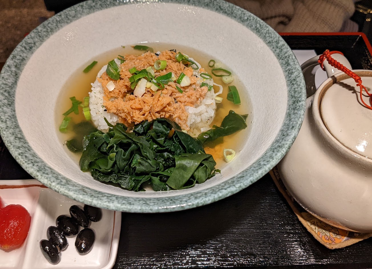 ?️「鮭魚茶漬飯」,鮭魚香氣濃厚,當天吃到的小菜有昆布、牛蒡,另外加購一顆溏心蛋,都特別美味。