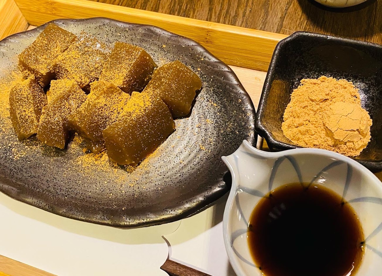 #蕨餅 這是一般蕨餅的口味 應該是黃豆吧 旁邊是無糖黃豆粉跟黑糖醬 我覺得沾醬太甜 不過我姐沾得很開心 但是❗️口感比較水一點 偏向果凍的感覺 我比較喜歡別家QQ的口感?♀️