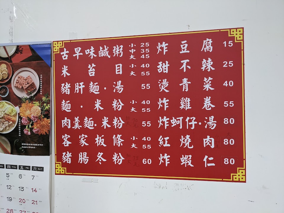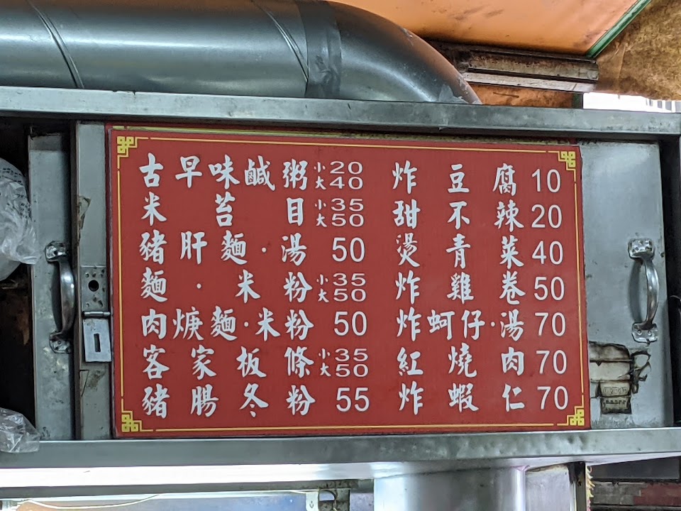 肉粥偏向泡飯,但高麗菜清脆、湯頭平實且好喝;客家粄條不軟爛,非常Q彈,配上豆芽菜可以吃上一大碗;紅燒肉單價較高,但給的也大方;炸豆腐是一般的板豆腐製成;雞捲比較特別,全數裹粉後再油炸,口感偏硬。以上都有配醃漬的小黃瓜跟泡菜,可以略解油炸物的油膩。