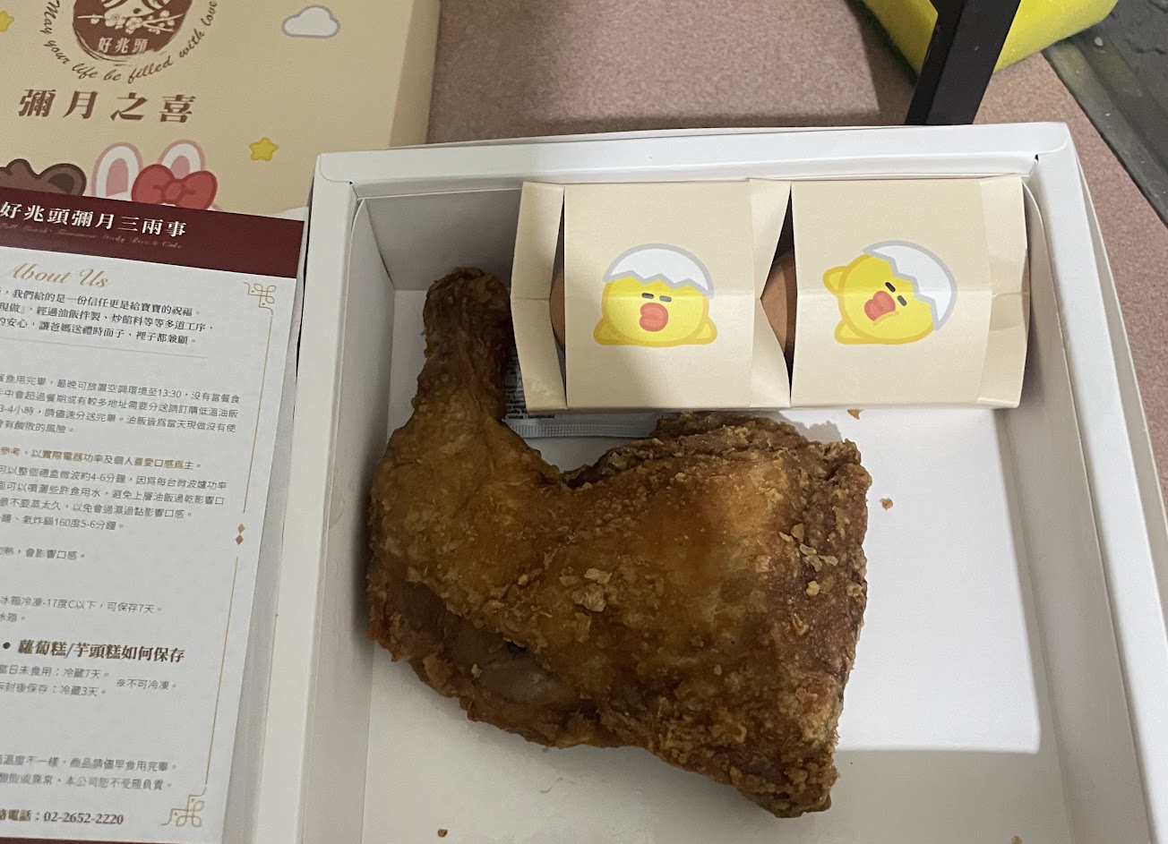 好兆頭是我第一家選擇試吃的彌月禮盒,試吃完就決定好兆頭當我們彌月禮了,寵愛雙拼真的是我很喜歡的組合,油飯、雞腿味道都很剛好,配上蛋糕覺得很滿足!在配送上也都很準時無誤,還在找彌月禮的人,我真的大推
