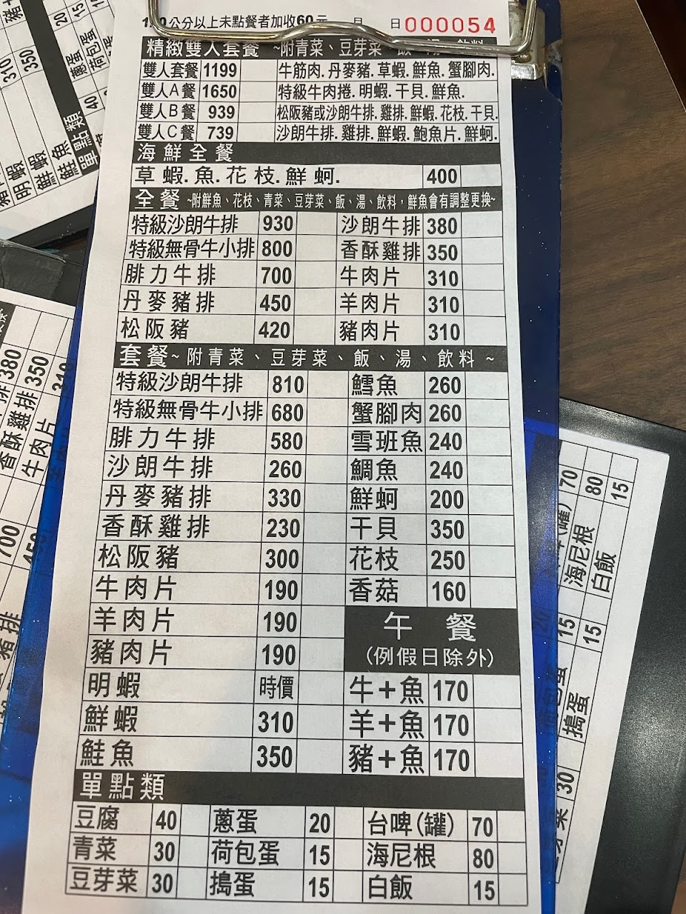 5點剛開門就進去消費,前面已有兩組客人,師傅看起來在做外帶,因第一次來,餐點畫好單要給廚師就請我們放桌上,後來服務生才來拿單。青菜等超久,隔壁桌比我們晚來,同時間拿到青菜,牛肉只點了一樣結果來兩盤,問了才知道服務生送錯,是要給晚來的隔壁桌。牛都快吃完了(不好吃、肉很柴)雞腿排還沒來,好不容易看到雞腿裝盤結果又是給隔壁桌,跟店員反應時剛好廚師有聽見,拿了一盤雞腿排要給我們時還邊說「不然先給你們」,滿頭問號!我們最先來的也先畫好單,餐點等了超久,結果跟隔壁桌同時間拿到不然就是直接給他們,跟你們反應結果得到這種回答,連一句抱歉這種話也沒說。東西不怎樣,態度也是,寧願買雞腿便當也不會再來第二次!