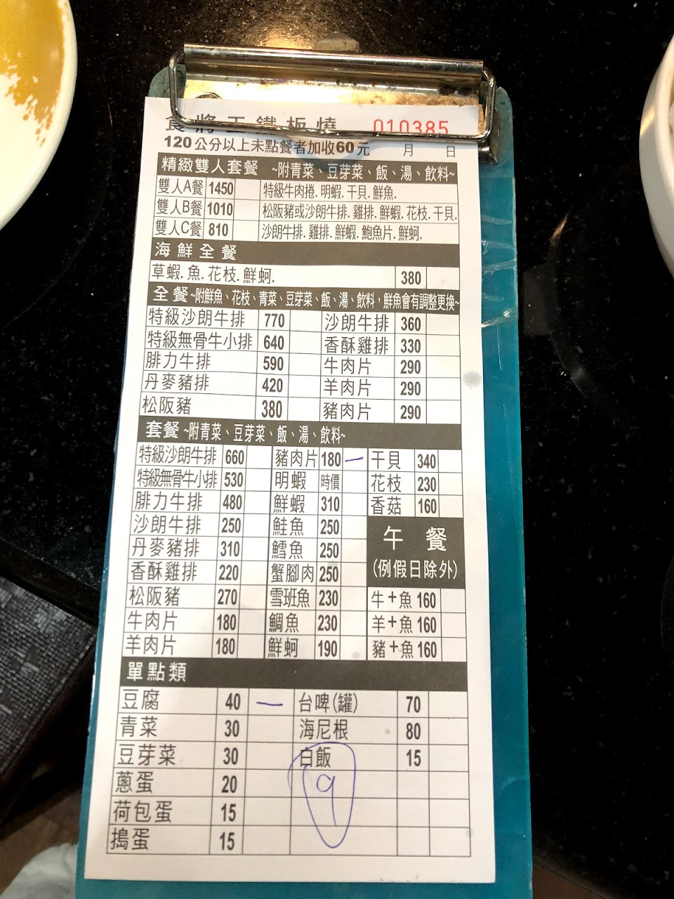 很傳統的平價鐵板燒店,店內座位不算太多 ,兩位師傅在裡面一起為客人料理服務;餐點部分,客人可依照自己喜好請師傅調整,基本上都還不錯;雞排煎的很嫩,青菜炒工也好吃。海鮮類的新鮮度還不算太差;老闆的態度和服務算是還滿親切的。 店內有喝到飽的汽水飲料機,白飯和附湯是自行取用;只是個人認為湯的部分有些太簡單了,今天是海帶豆腐湯,感覺裡面的料有些少,以他的價位我個人認為附餐的部分是還有進步的空間。雖然價格談不上貴,但主餐分量的部分不算太多,食量大的朋友們可能要靠白飯墊肚子了…