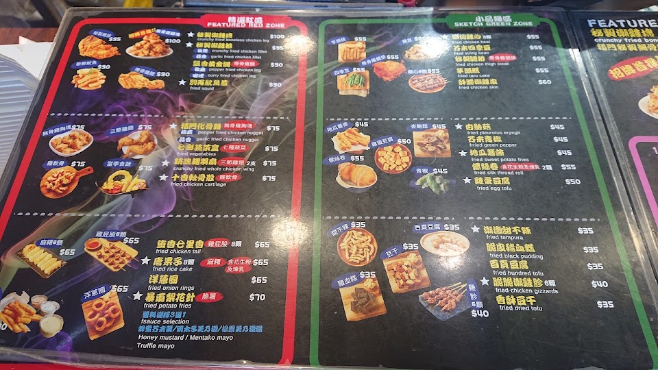 價位在35-100之間的炸物店,雞塊雞排100是主打,評論送炸物沒一區炸物搭配都有折扣,很意外還有賣口水雞涼麵跟丼飯,店員武士頭很親切,買290還幫忙蓋三個章,積滿十個章免費送一片雞排,雖然吃的偏貴但有做得出特色,而且服務跟好吃程度對得起這個價格!