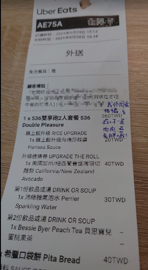 雖然點餐出了點狀況(Foodpanda 的問題)最後還是有重做順利拿到餐點!處理能力很好!?? …